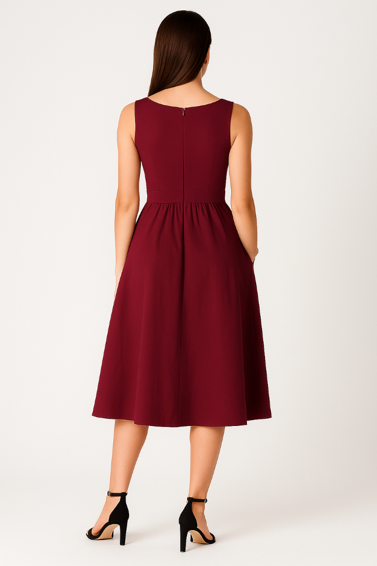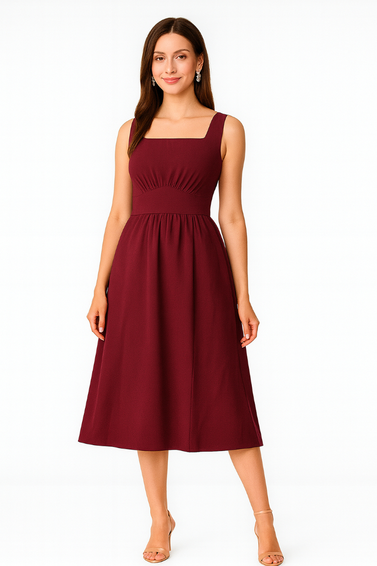 This cotton jersey dress delivers a clear, balanced silhouette with its square neckline and banded empire waist. The bodice gathers softly into the waistband, giving the upper shape a defined but comfortable hold. The skirt falls in a smooth, even line for a relaxed midi length that moves easily through the day. The jersey fabric keeps the fit steady and soft, making it suitable for work-casual settings or simple daytime plans. The rich tone pairs well with heels or flats while maintaining a clean outline. Wash cold and dry low to protect the fabric and drape.