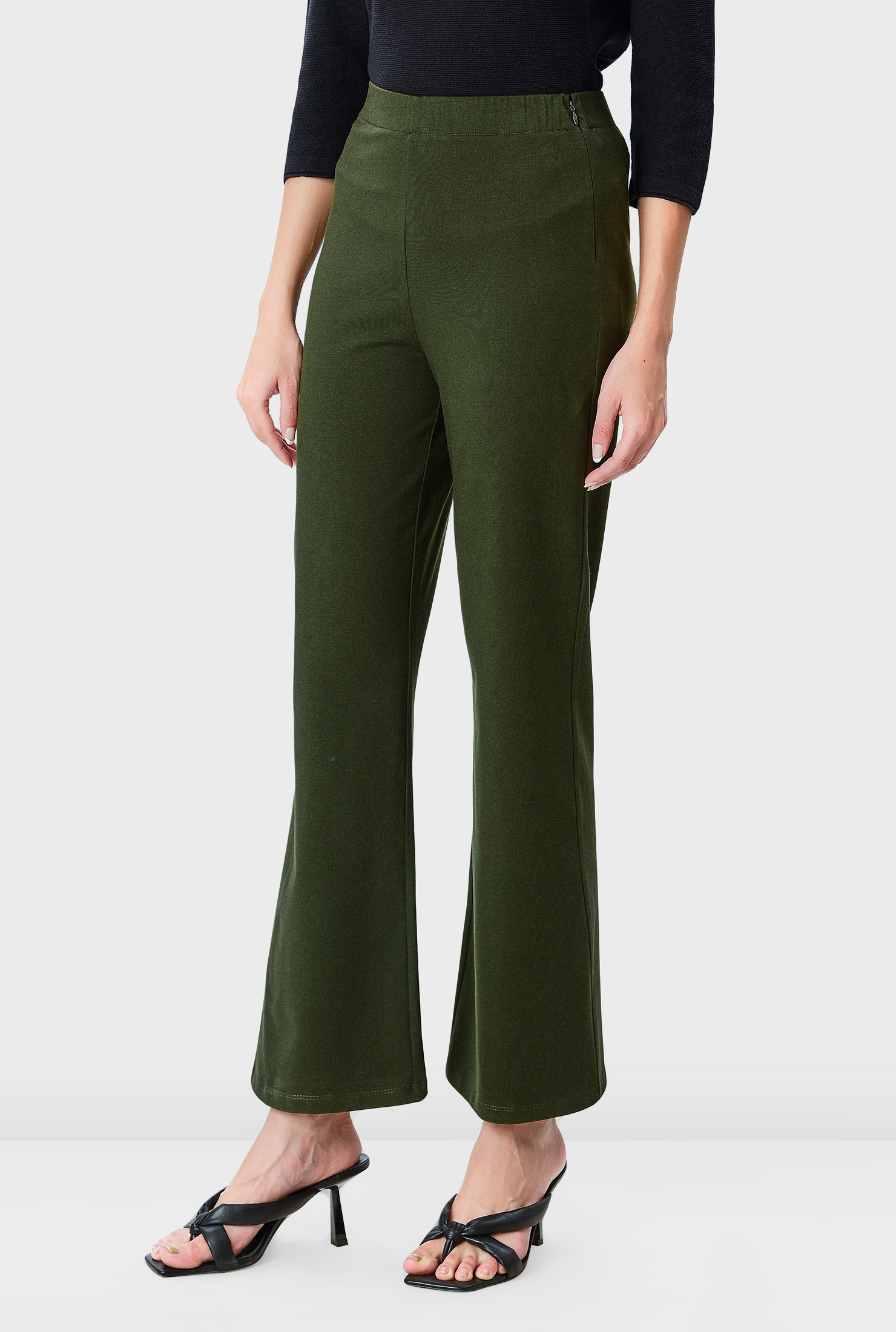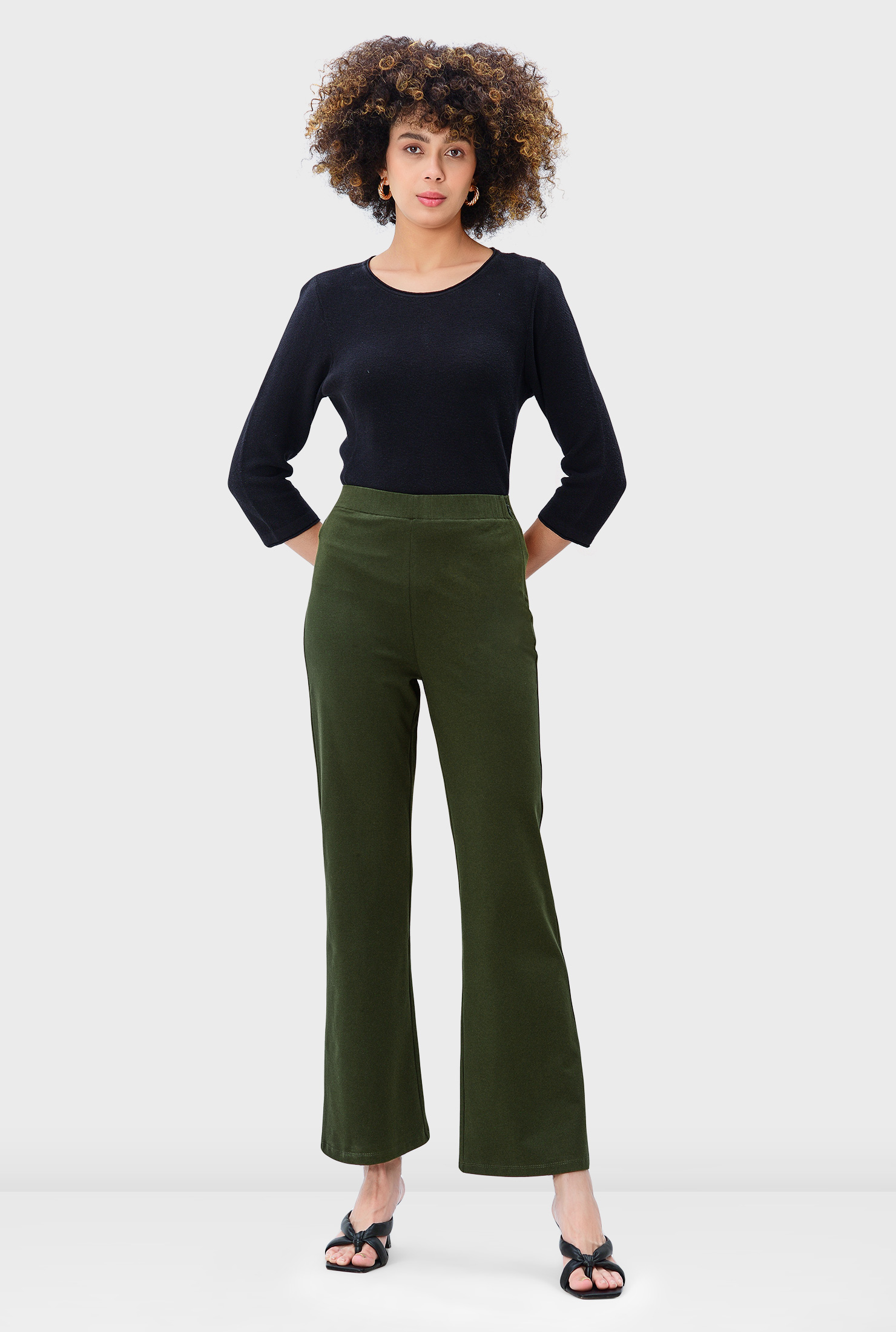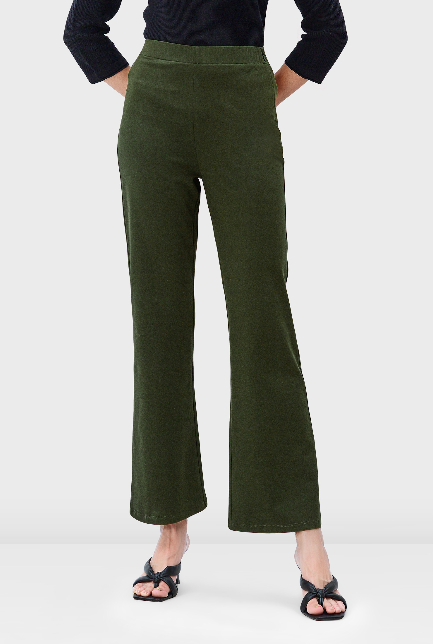 Comfortable boot-cut jersey pants designed for casual and work-casual wear, offering a slim fit through the thighs and a balanced flare for easy movement.