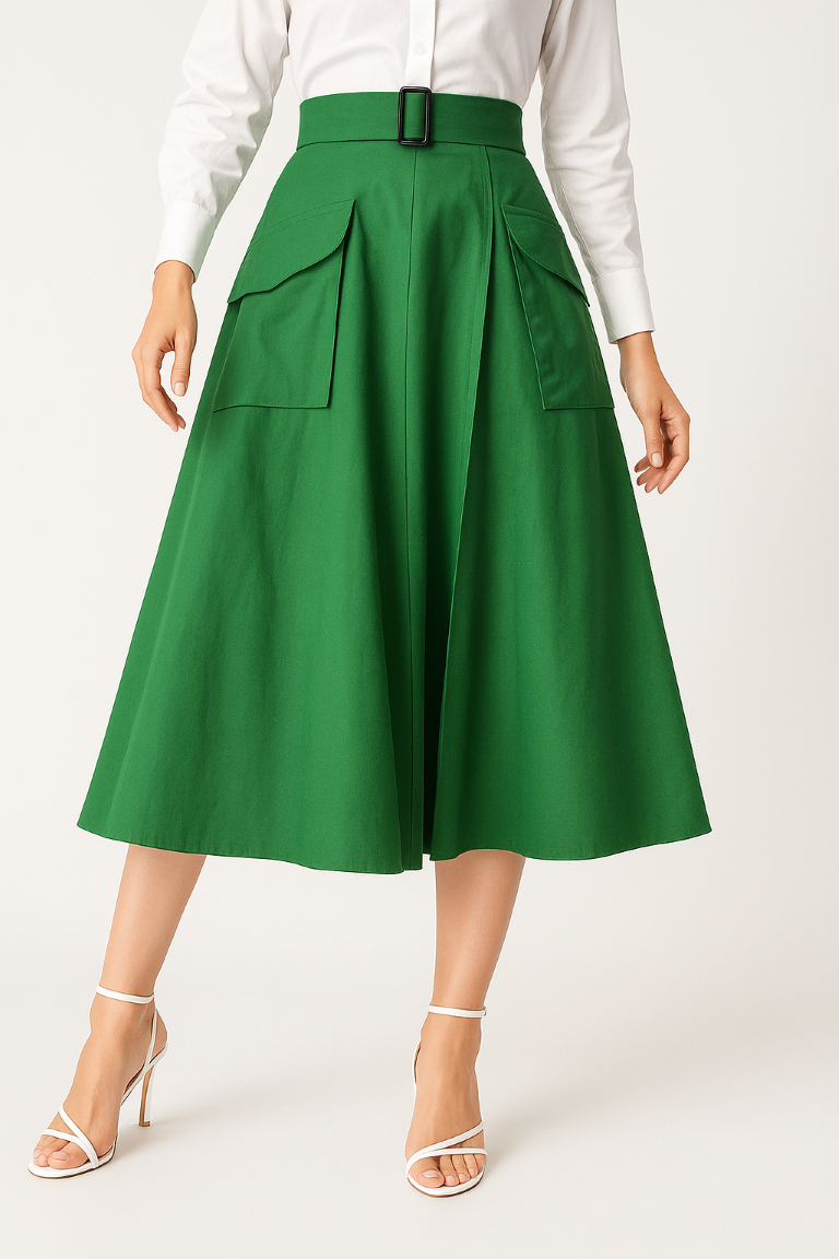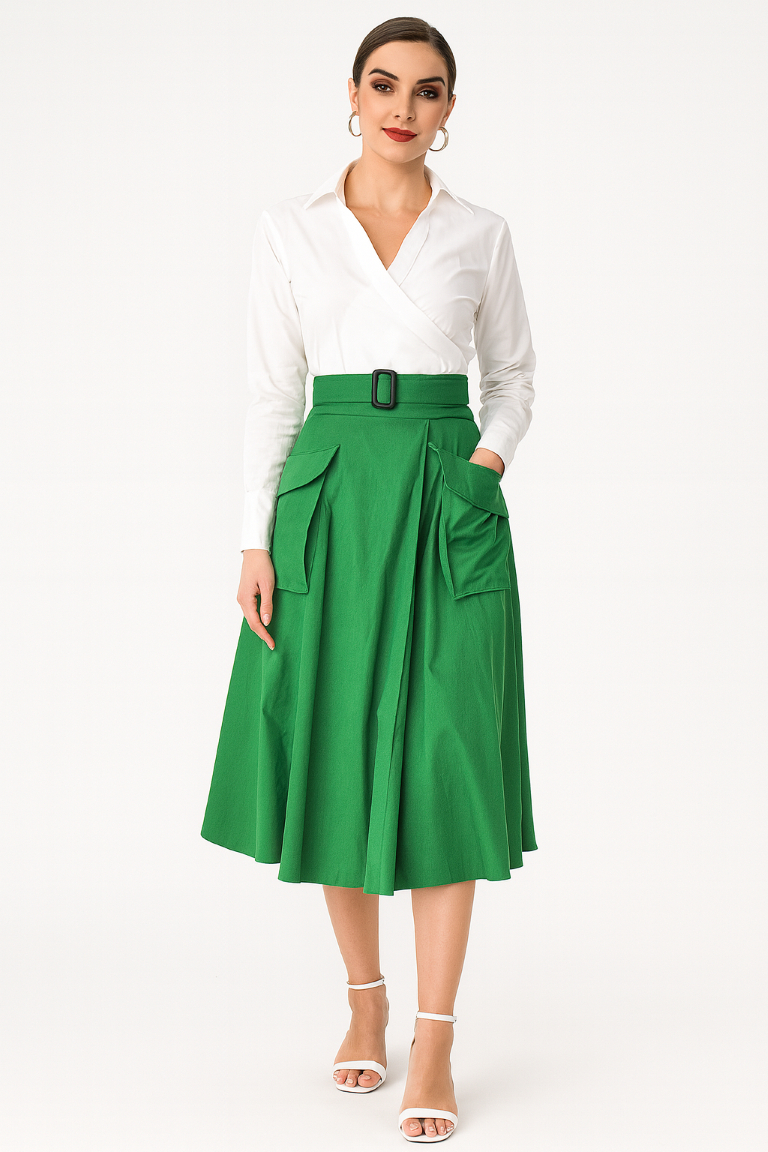 A cotton poplin faux-wrap midi skirt with a high waist, cargo pockets, and a clean A-line fall. The crisp fabric and structured shape give a sharp work-casual look with steady movement and practical detailing.