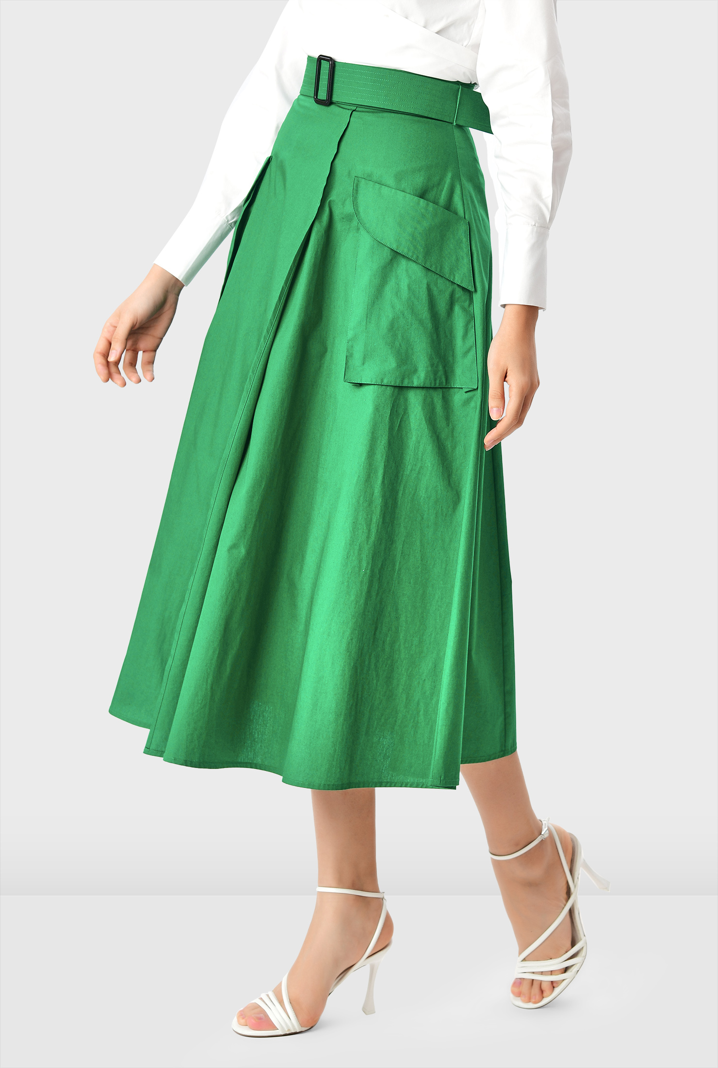 A stylish faux-wrap cotton poplin skirt designed with utility-inspired cargo pockets for a modern work-casual look.