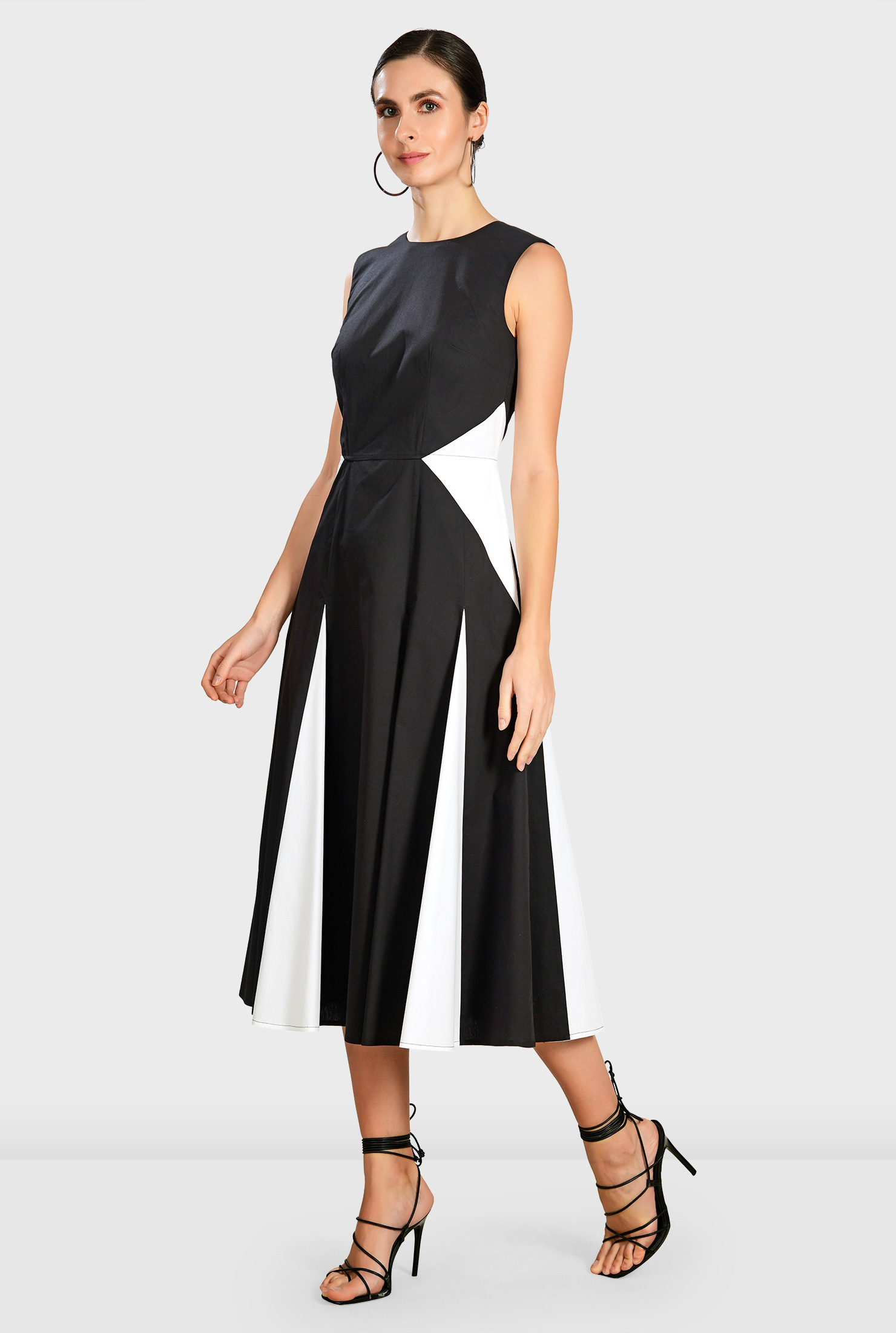 Upgrade your wardrobe with this timeless black-and-white colorblock dress made from premium cotton poplin. The sleeveless design offers a clean and contemporary silhouette while the inset panels create movement and contrast. Ideal for dressing up or down, this piece is versatile enough for office wear, dinner outings, or casual events. Comfortable, lightweight, and easy to style — a perfect staple for any season.