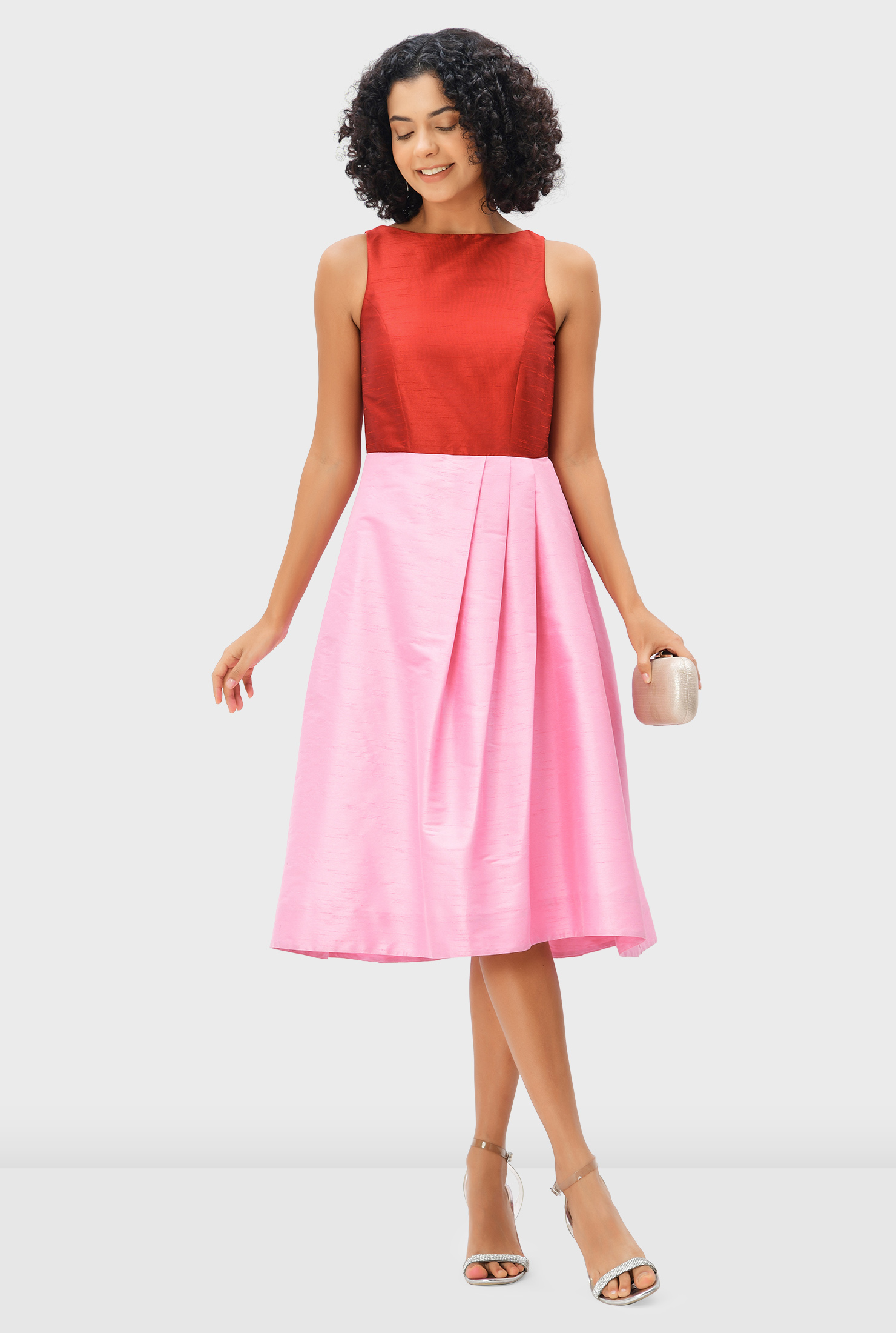 A colorblock dupioni dress with a smooth sleeveless bodice and a pleated fit-and-flare midi skirt. The crisp fabric, clean contrast, and structured shape create a polished wedding-guest look with steady movement.