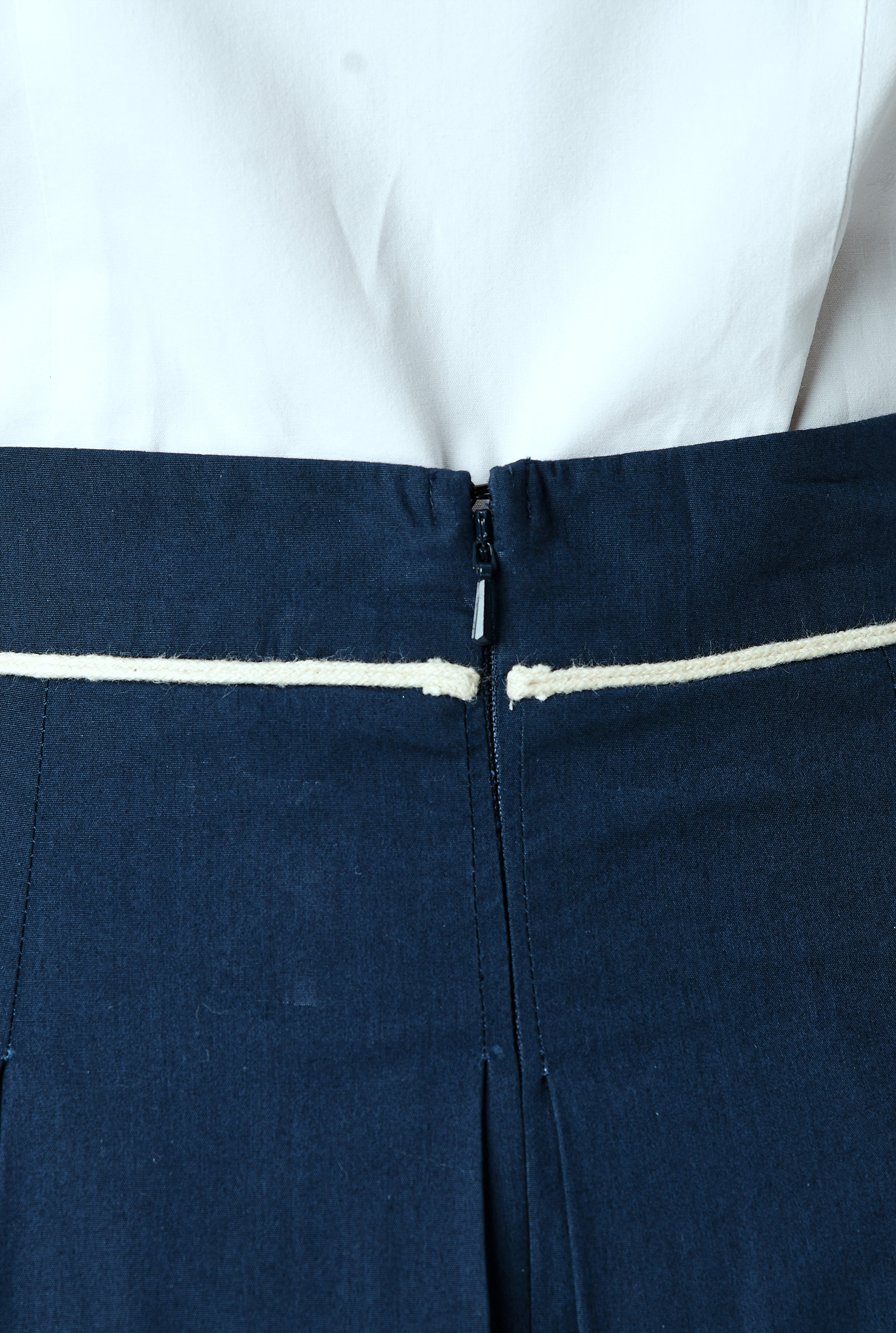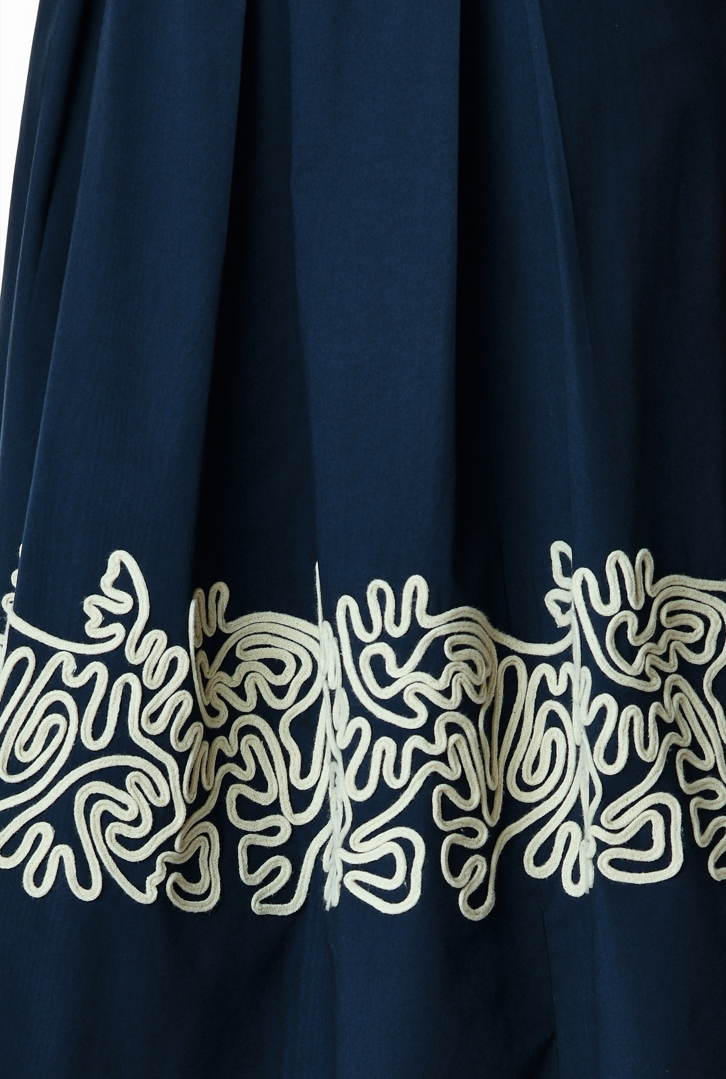 What sets it apart is the ornate cord embroidery sweeping around the hem—an intricate, dimensional design that adds instant visual interest and sophistication. The richly textured embroidery creates a bold contrast against the deep navy poplin, giving the skirt a statement-making finish ideal for social gatherings and polished events.