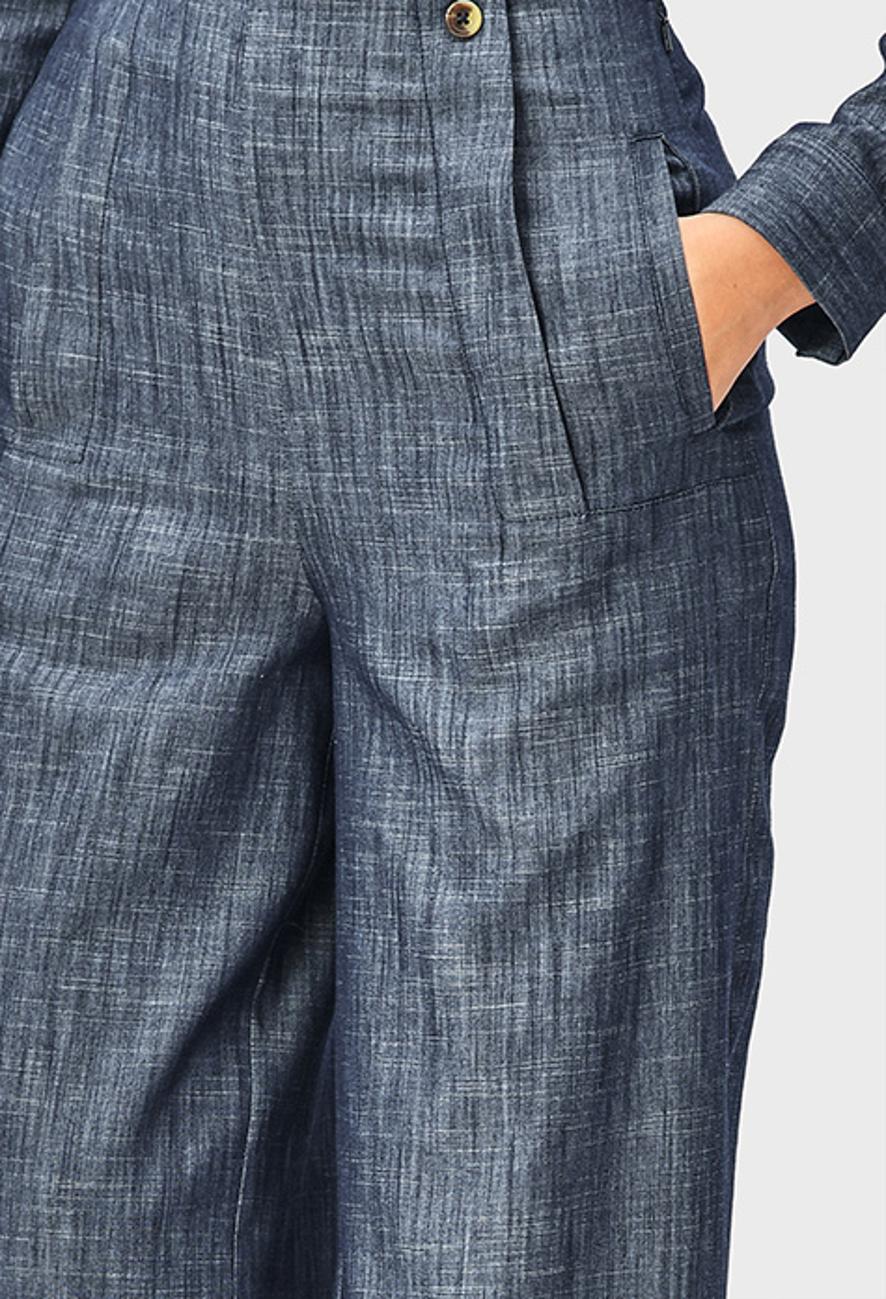 Wide-leg chambray pants with a high waist, clean front, and soft drape. The structured cotton blend gives steady shape while keeping the fit relaxed for work-casual wear.