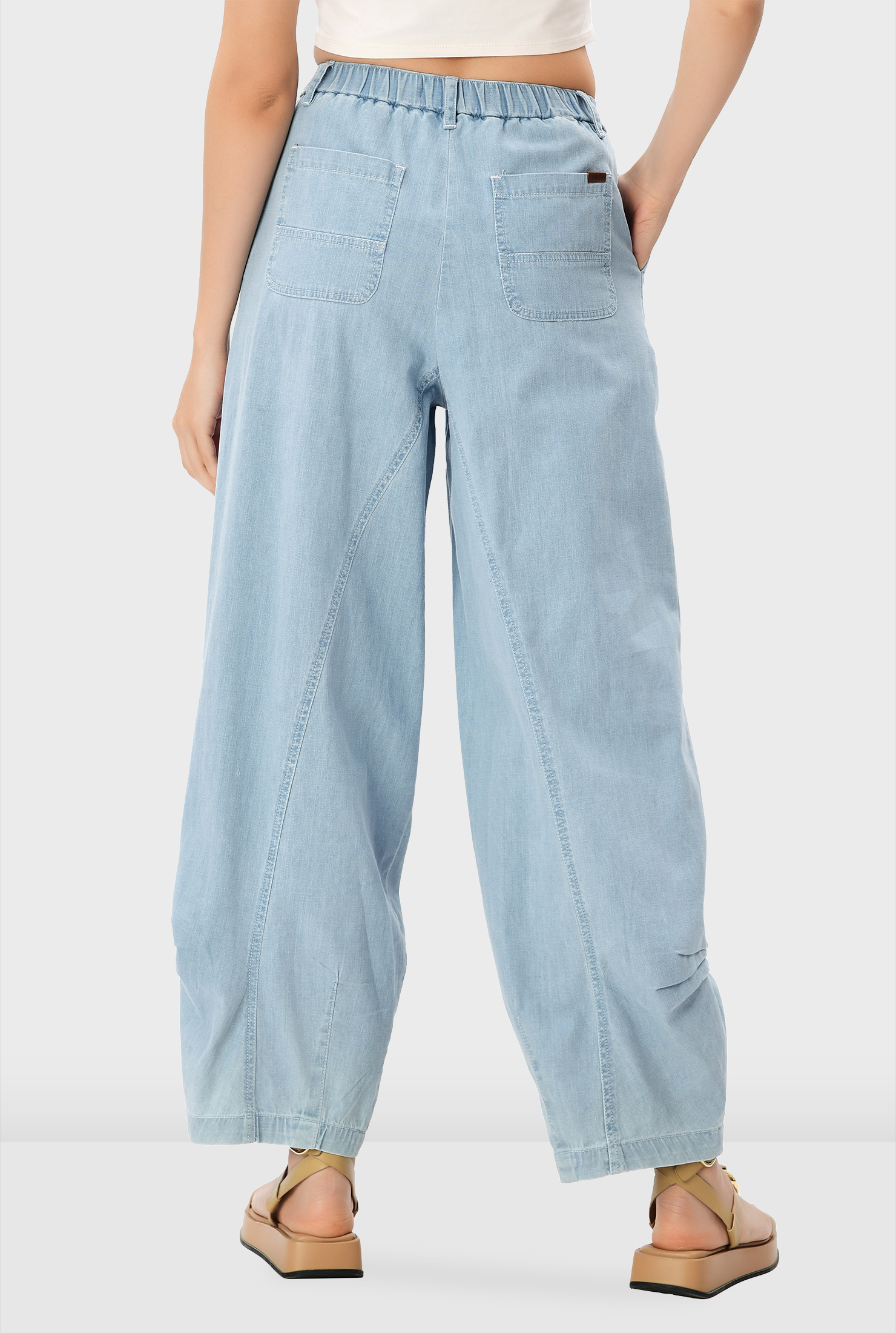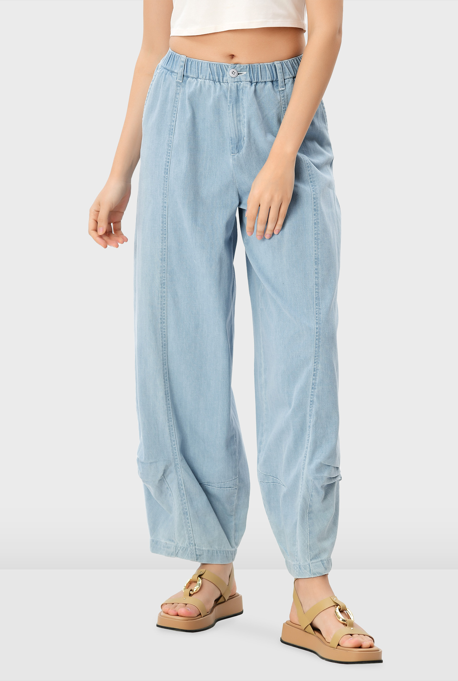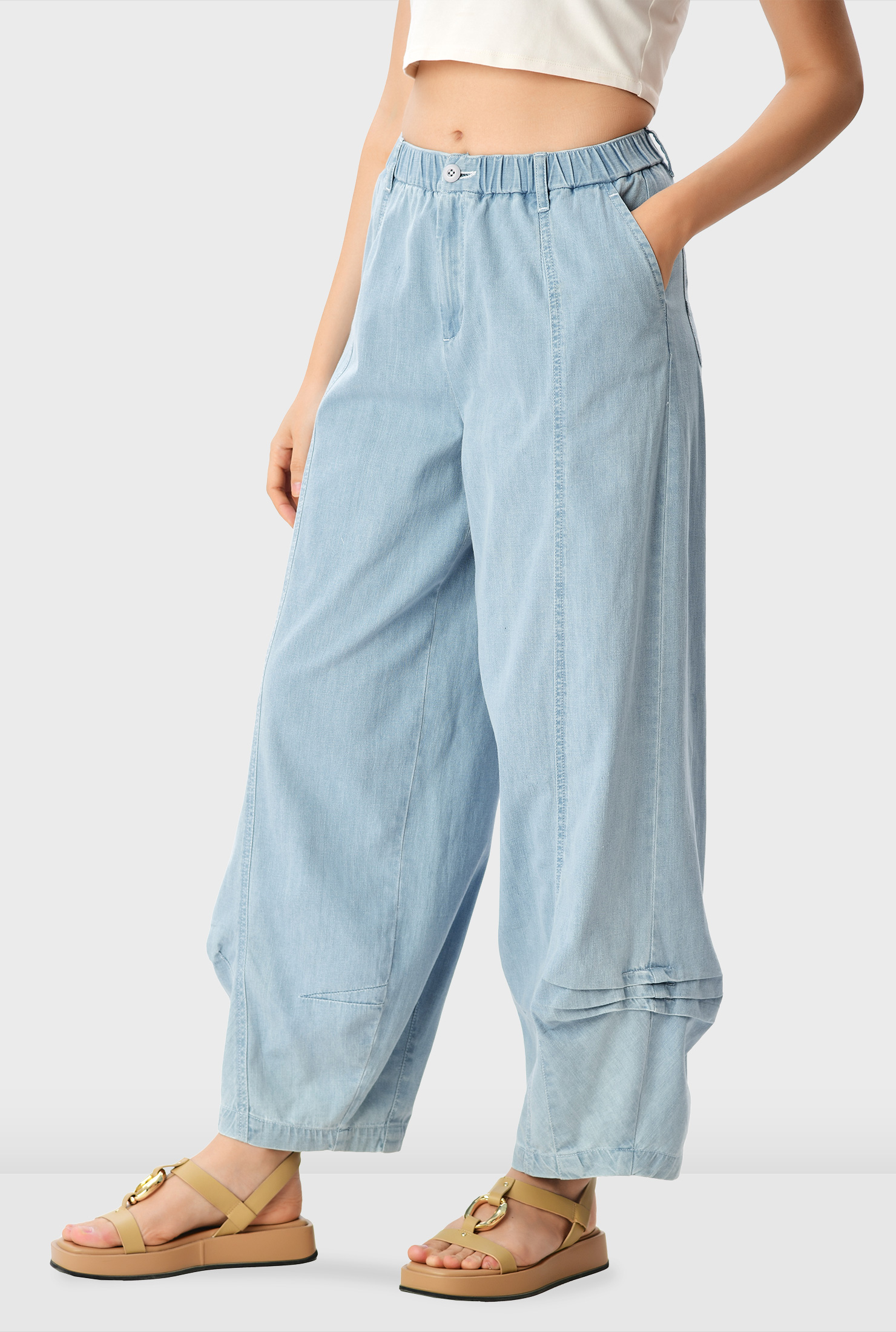 Light, flowy, and effortlessly modern—these voluminous shirred denim pants bring ease and polish to your everyday style.