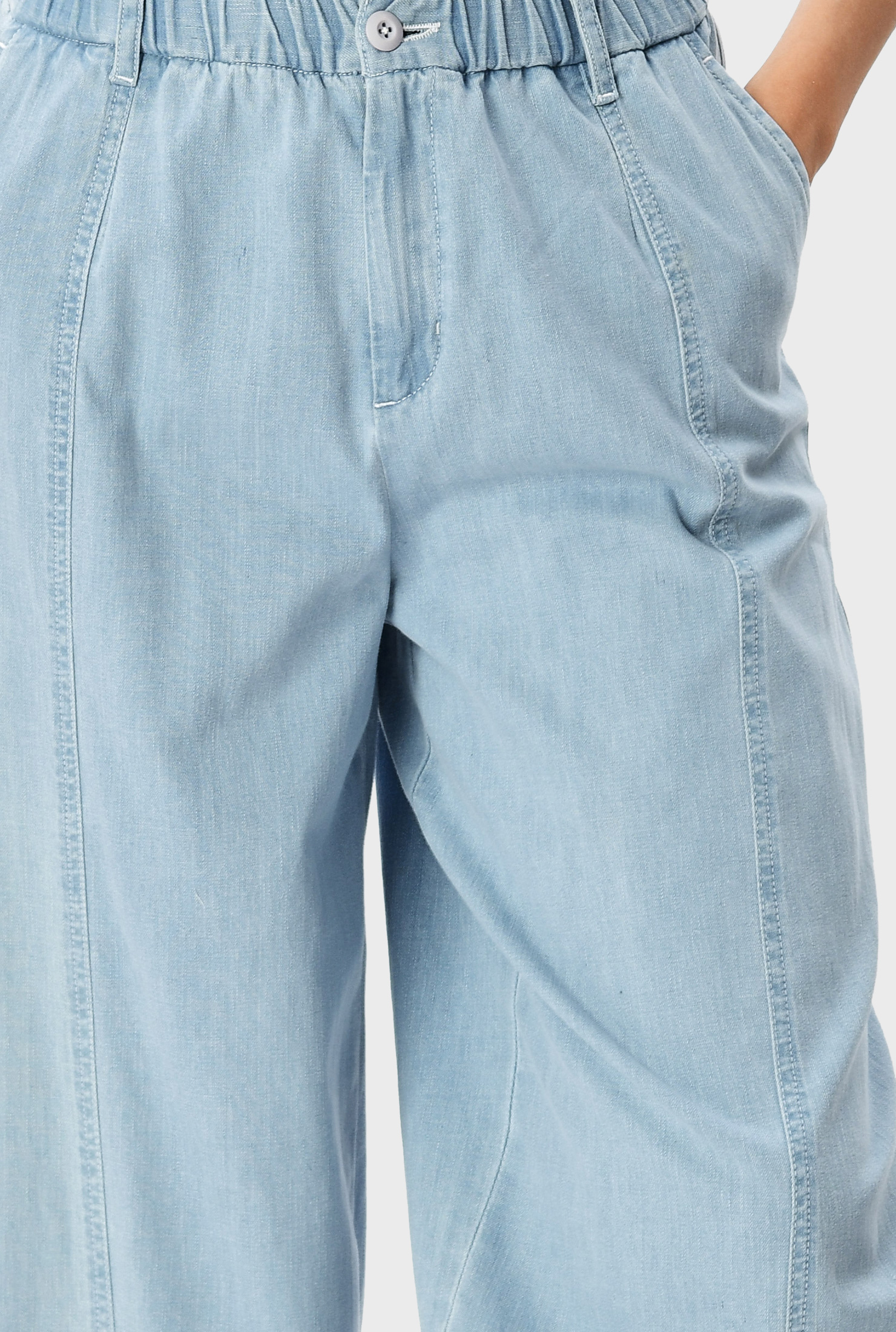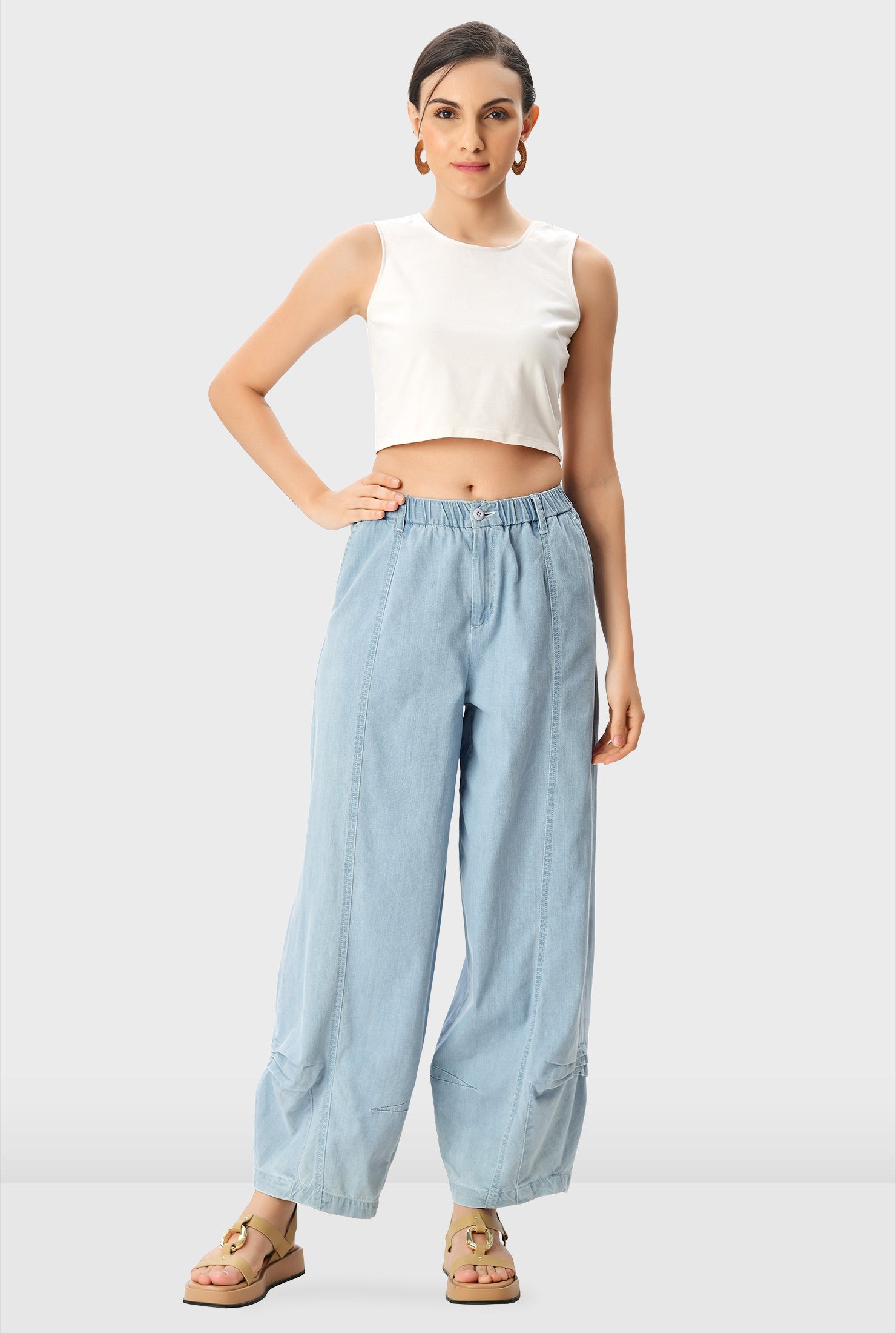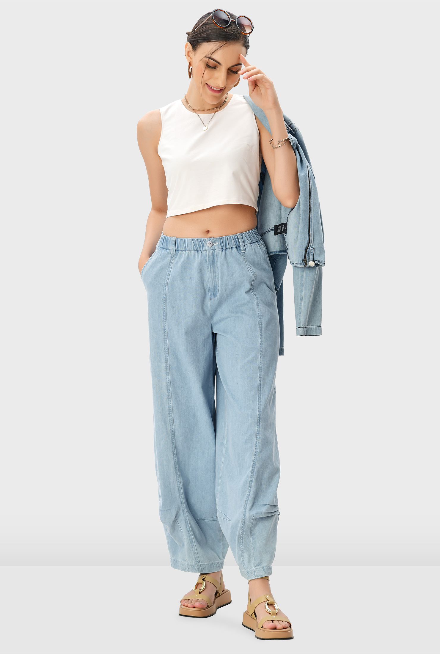 Light, flowy, and effortlessly modern—these voluminous shirred denim pants bring ease and polish to your everyday style.