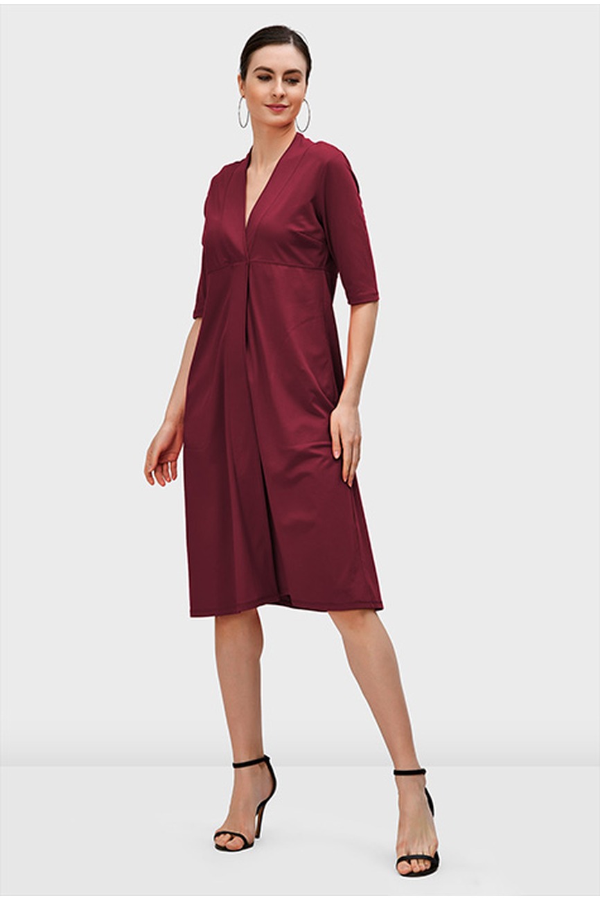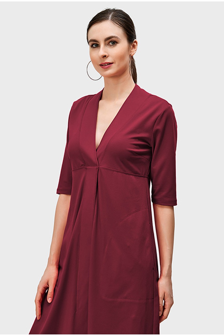 This cotton jersey A-line dress brings a clean, steady shape with its empire waist and deep V-neckline. The elbow-length sleeves keep the look sharp while giving enough coverage for work or daytime plans. The front pleat guides the drape and adds a soft structure to the flow of the skirt. The jersey fabric moves smoothly, making it easy to wear for long hours without feeling restrictive. The rich tone keeps the style refined and works well with flats, low heels, or simple accessories. Wash cold and dry low to maintain the fit and surface.