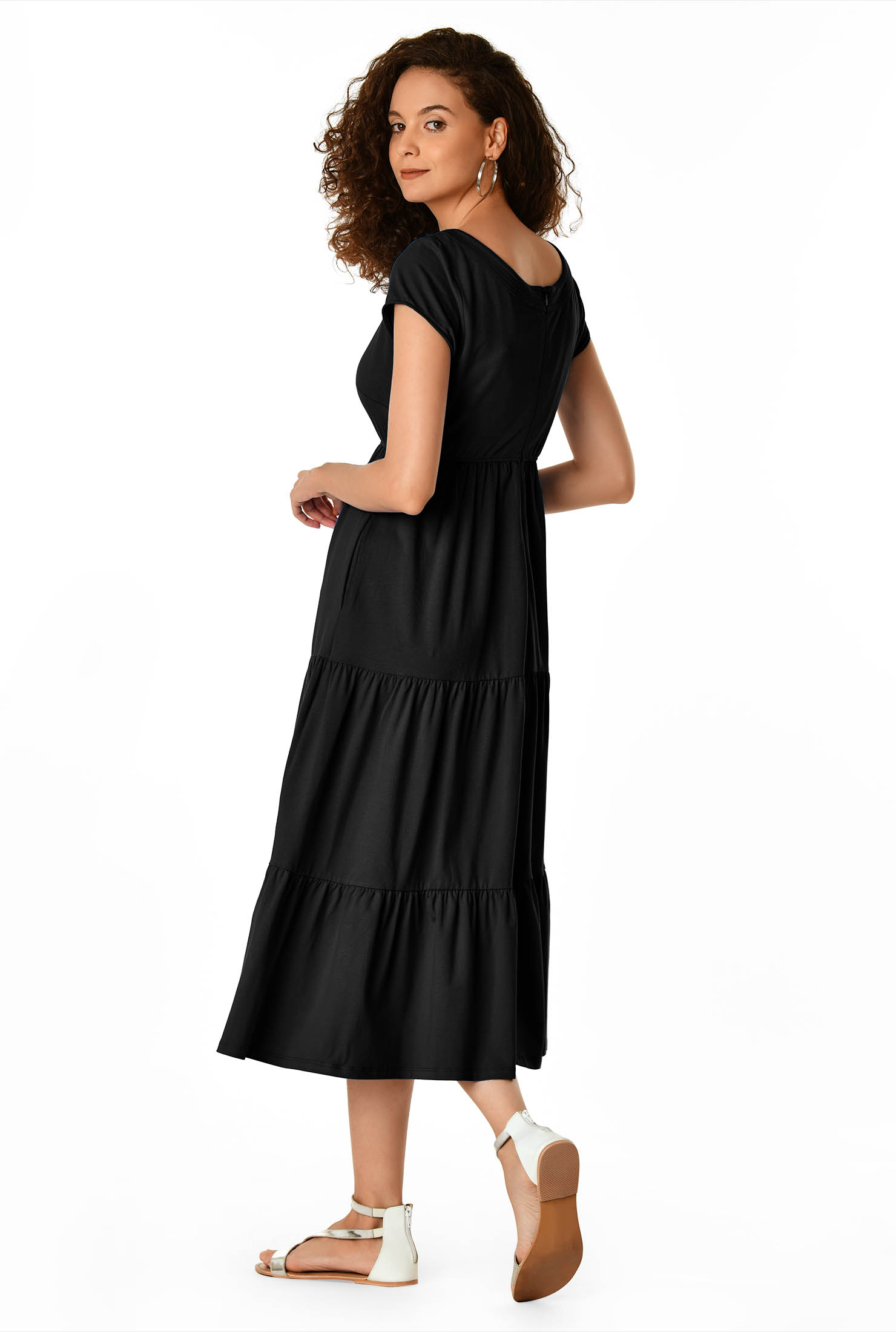 A soft and effortlessly stylish cotton-knit dress designed with an empire waist and breezy tiered skirt for all-day casual comfort.