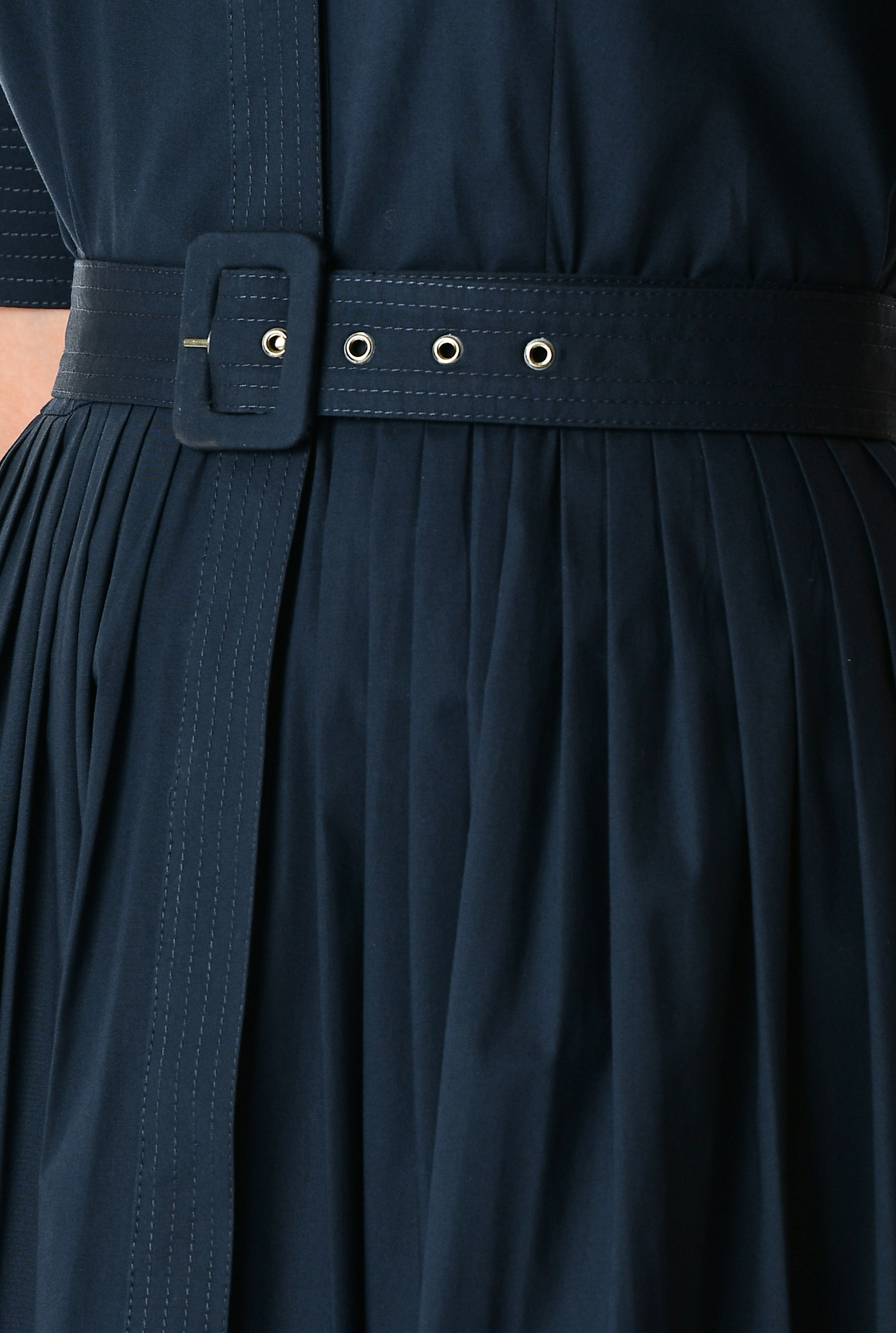 At the waist, a matching adjustable belt highlights the silhouette and flatters the figure, complementing the pleated full skirt that adds gentle volume and movement. Its navy-blue tone enhances its timeless and versatile appeal.