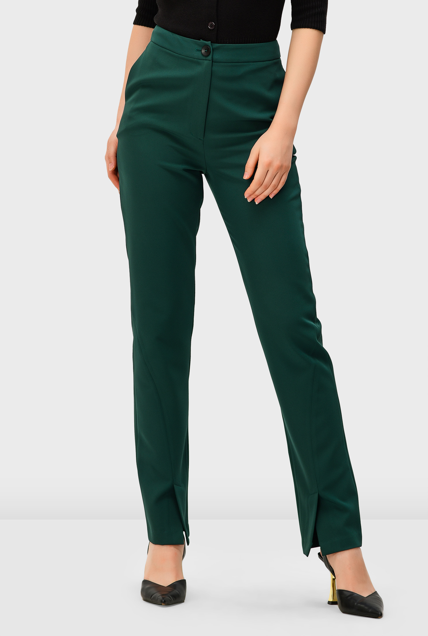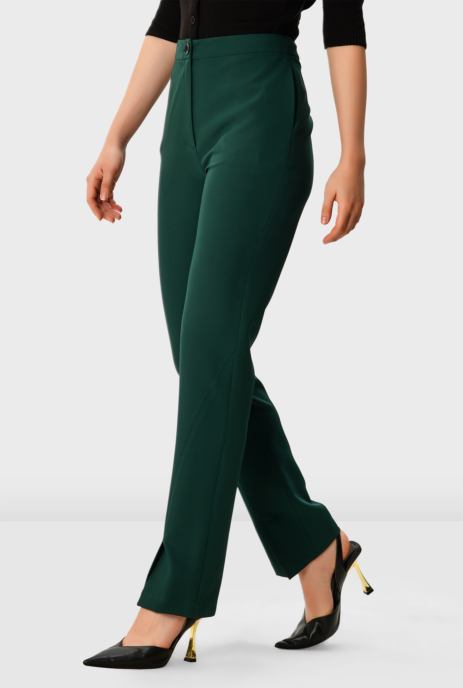 The high banded waist creates a clean, tailored silhouette, while the kicky front vents add movement and visual interest—making them perfect for transitioning from daytime meetings to evening outings.
