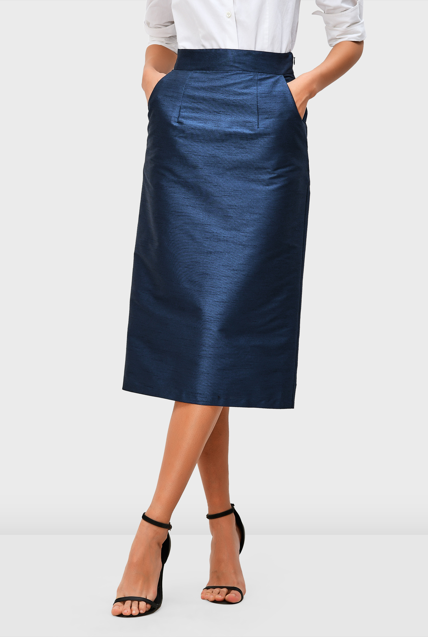 Perfect for dressy occasions, it pairs beautifully with blouses, fitted tops, cropped jackets, and evening separates. The lightly lustrous dupioni finish gives the skirt a polished, upscale appearance—making it ideal for weddings, cocktail parties, formal dinners, or any event where you want a chic, refined look.
