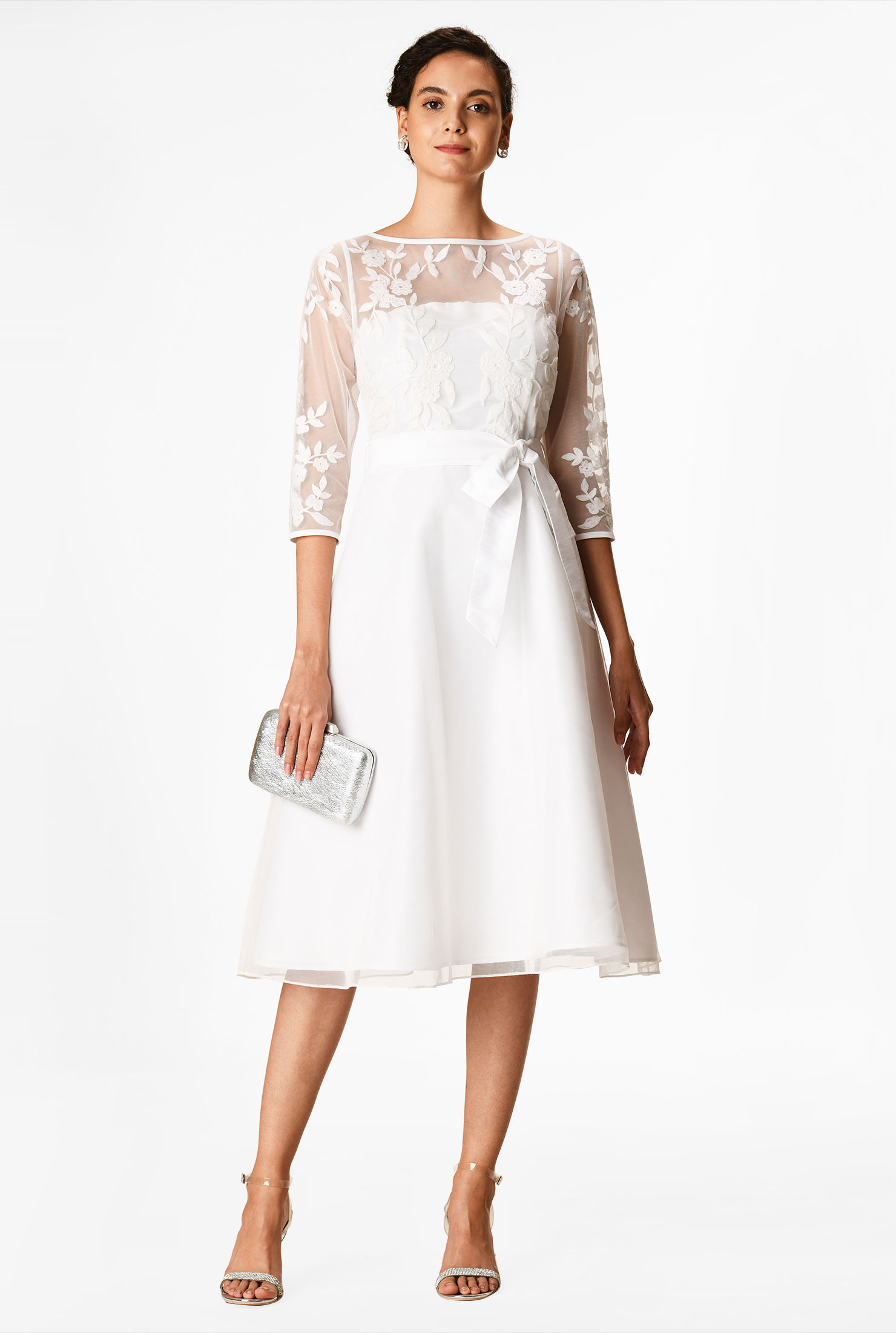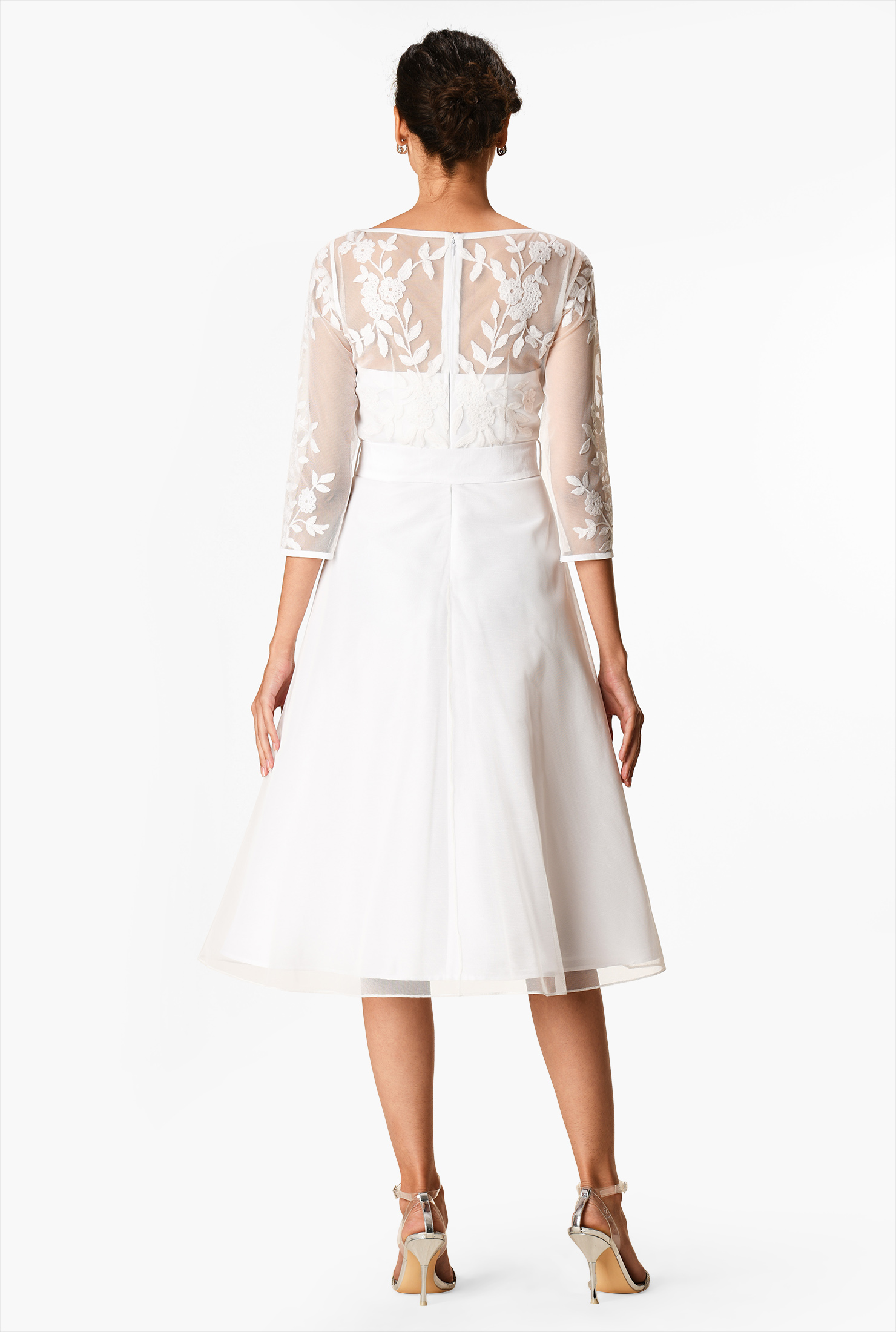A delicately embellished illusion-tulle dress layered over smooth polydoupioni, adding elegant charm to festive and formal occasions.