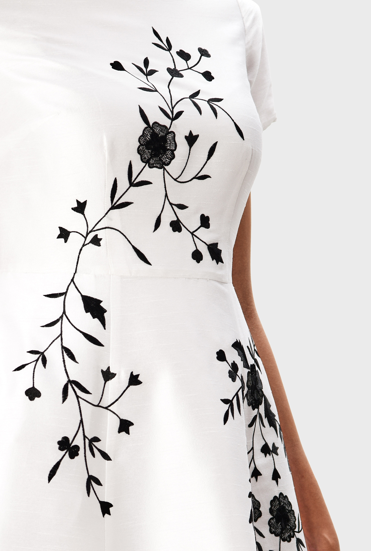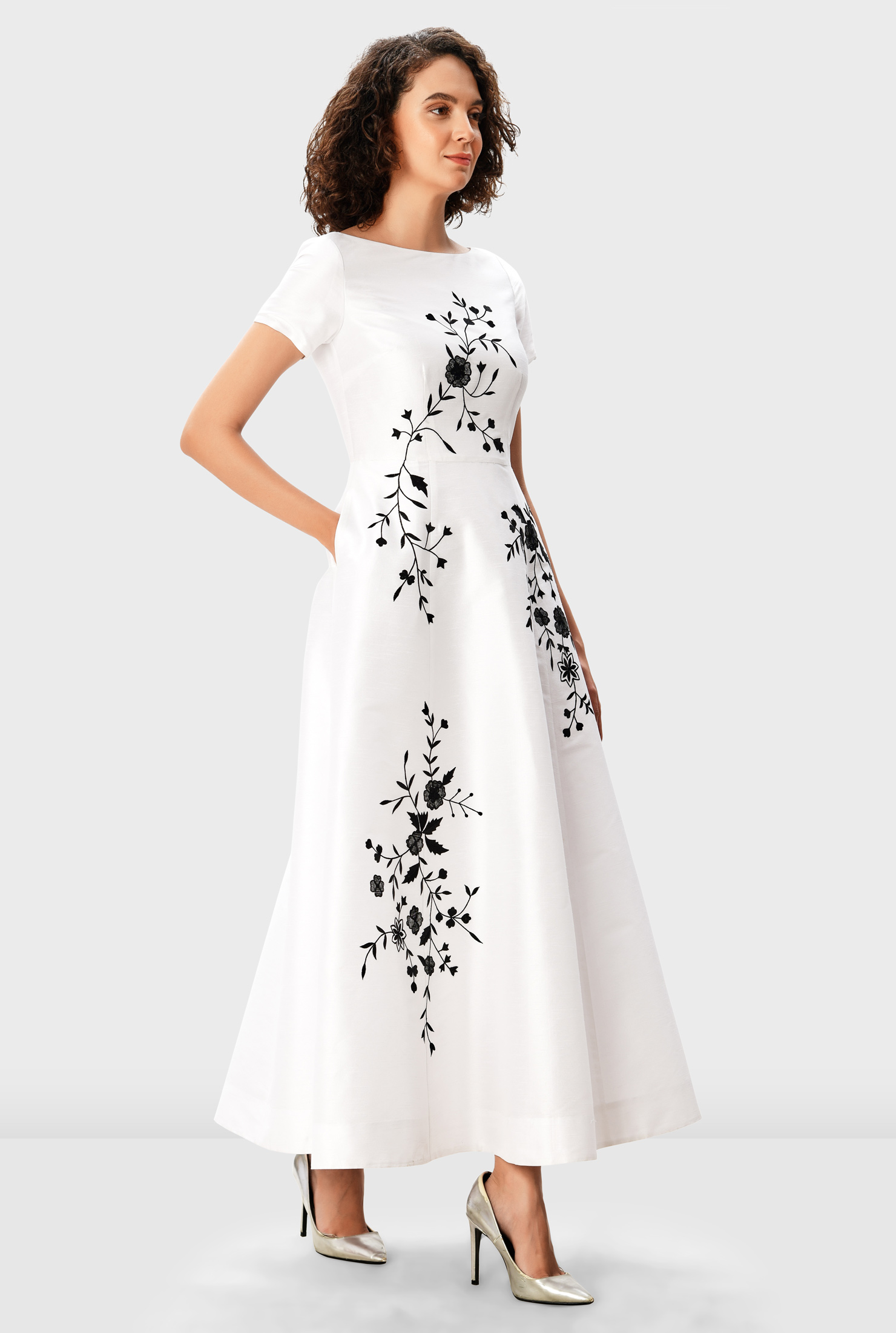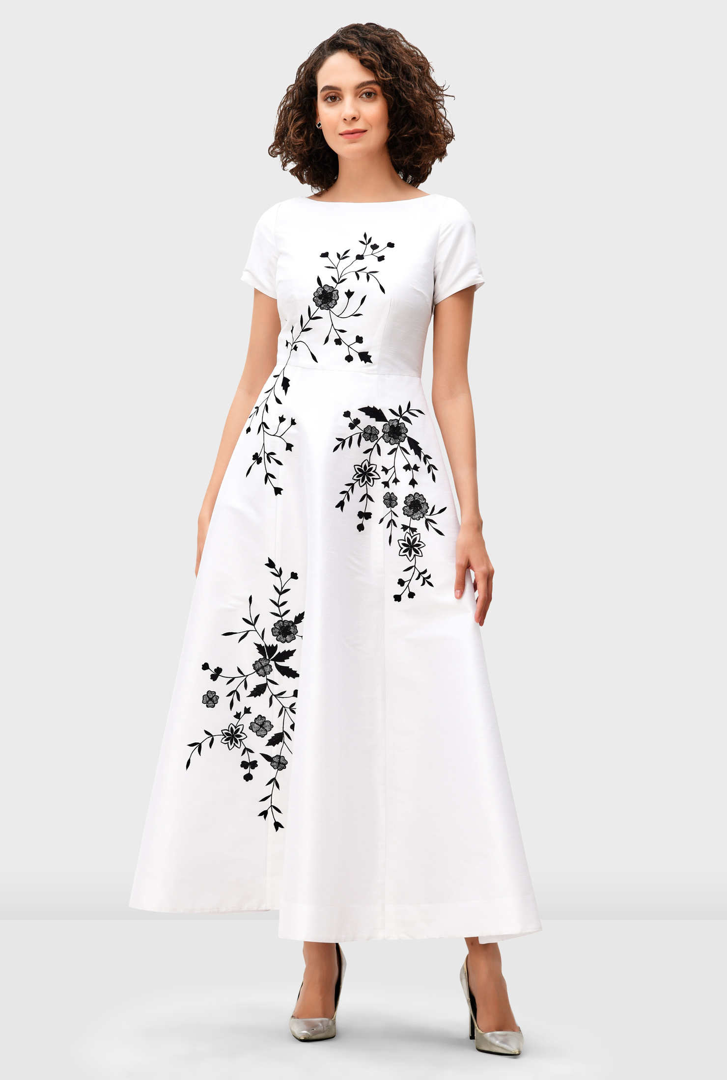 A timeless dupioni maxi dress adorned with elegant floral vine embroidery and finished with a fitted bodice and full flared skirt.