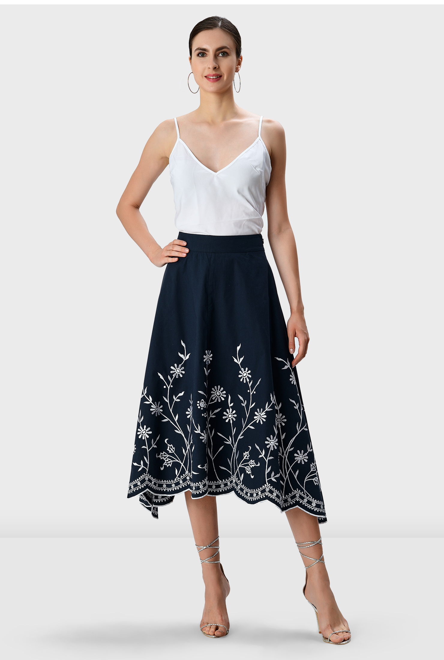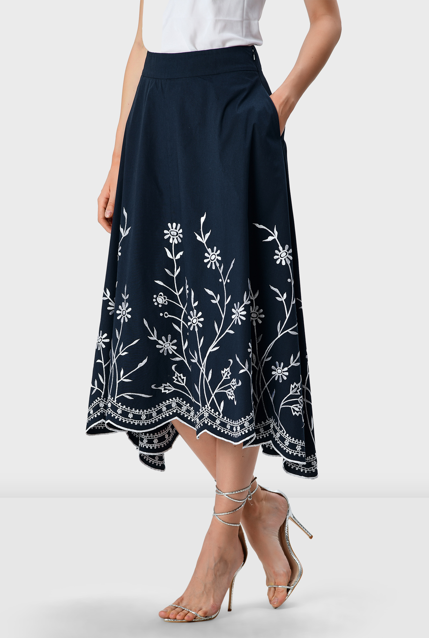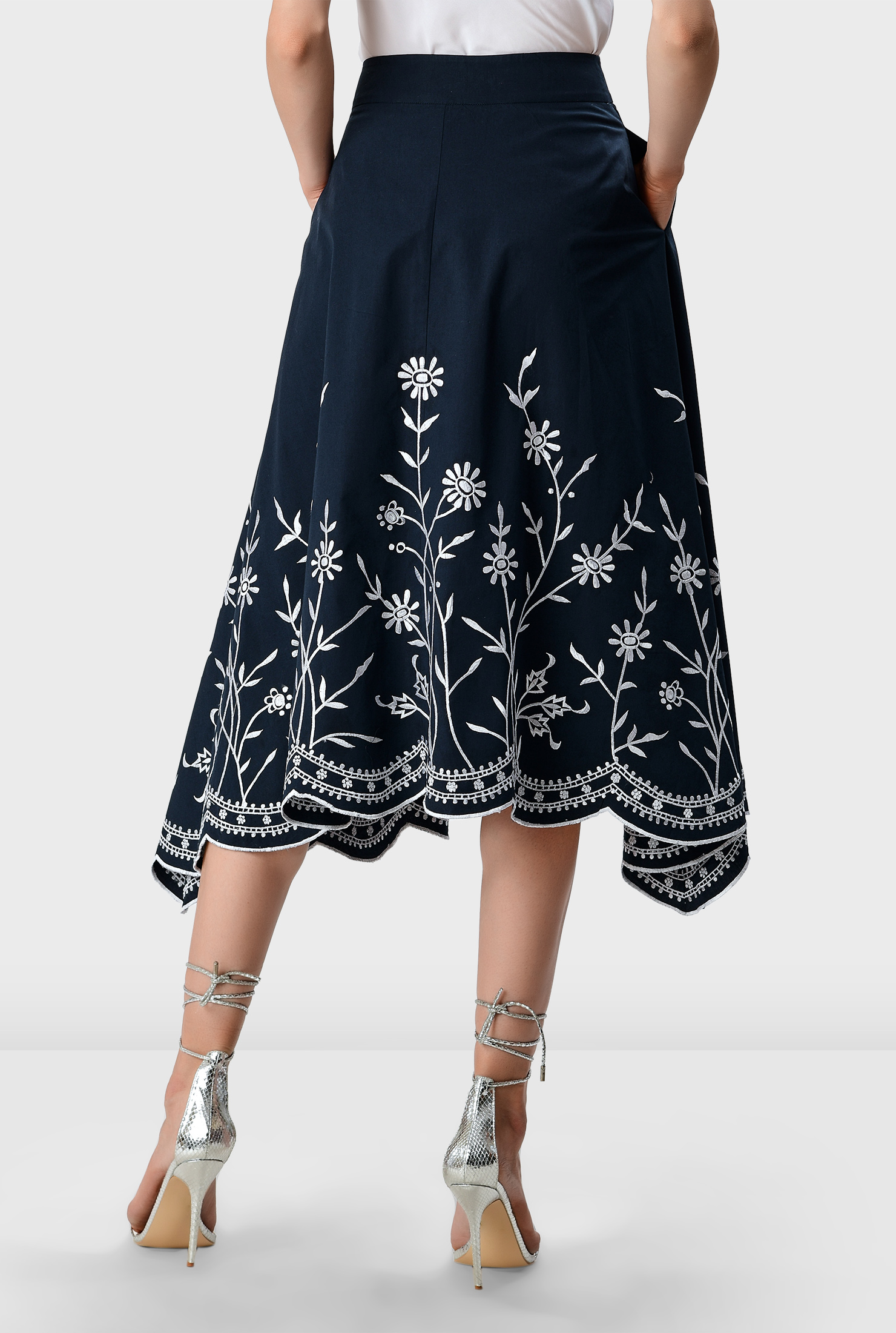A lightweight cotton poplin high-low skirt featuring delicate scallop embroidery and a flattering full-flare silhouette.