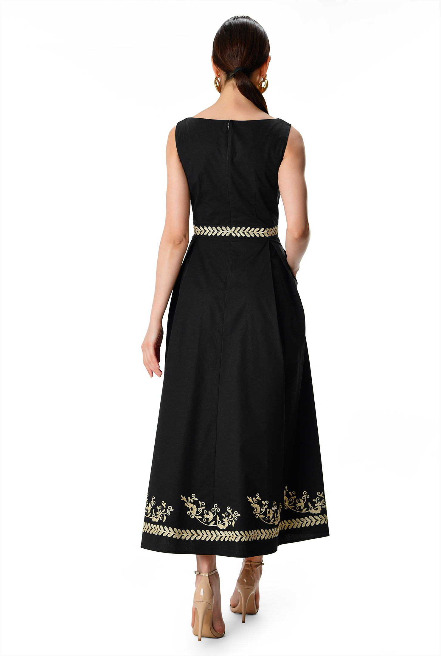 Floral Vine Embroidery Cotton Poplin Maxi Dress