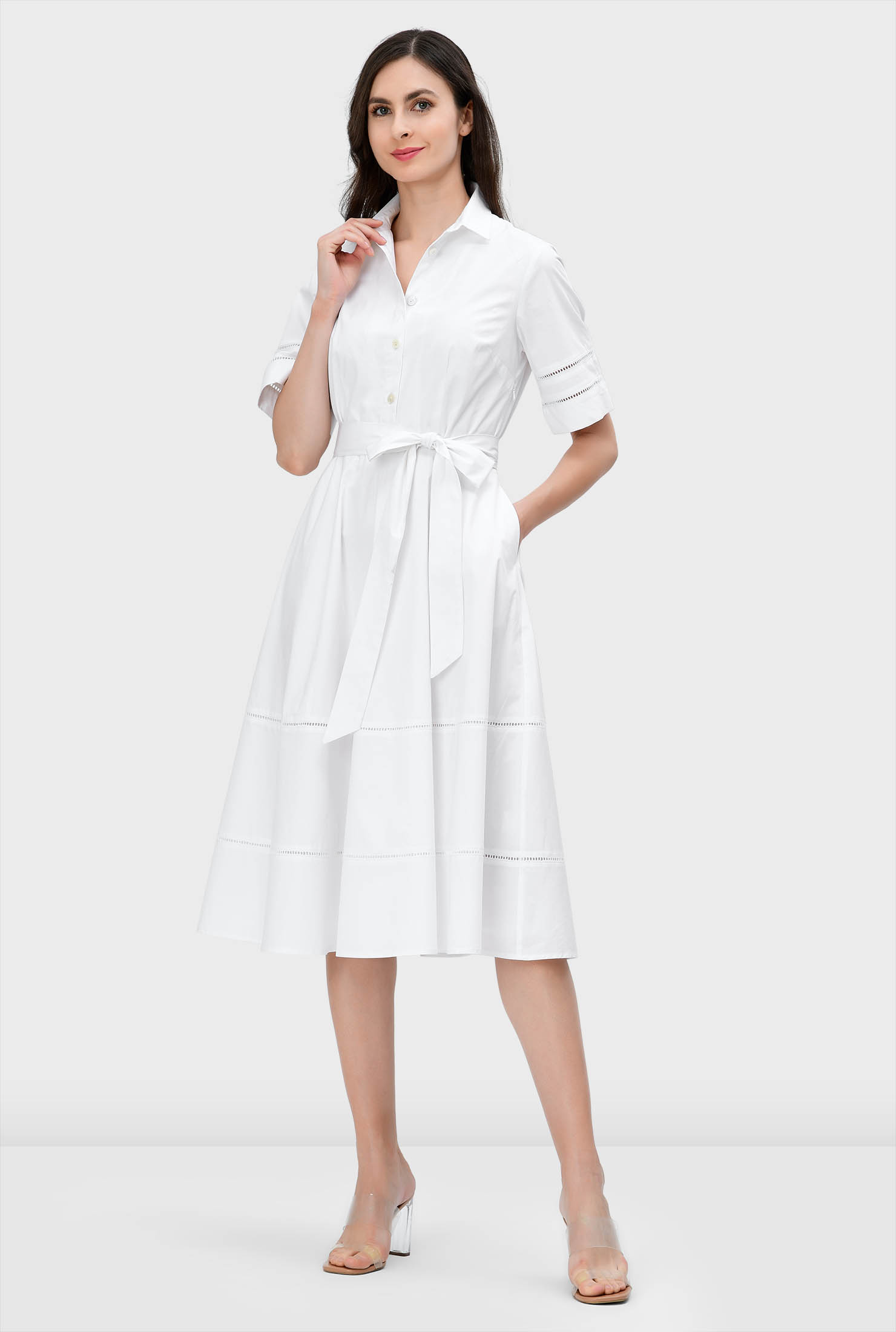 A polished cotton-poplin shirtdress elevated with delicate lattice trim, a full flare skirt, and an optional self-tie belt for a feminine, smart-casual look.