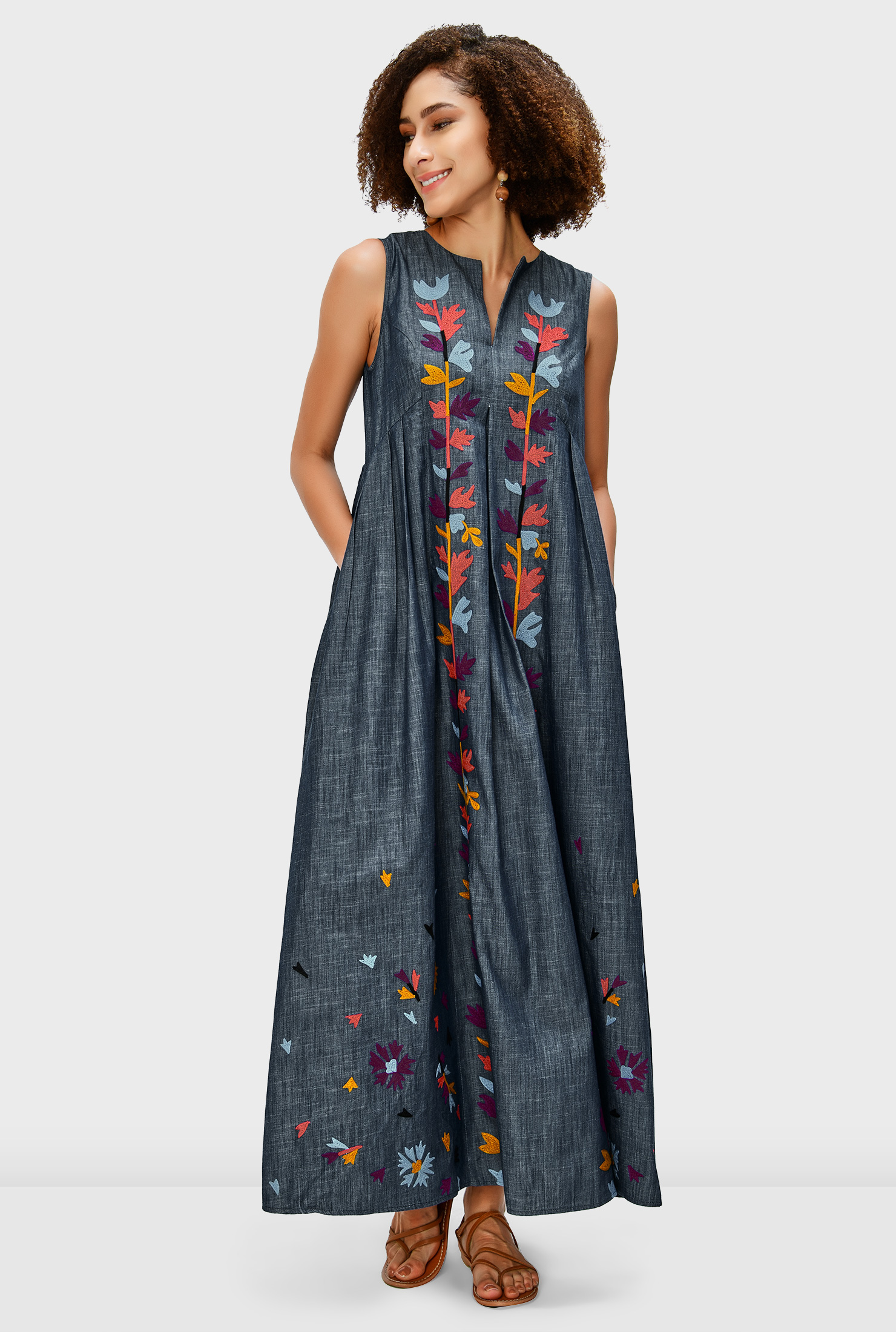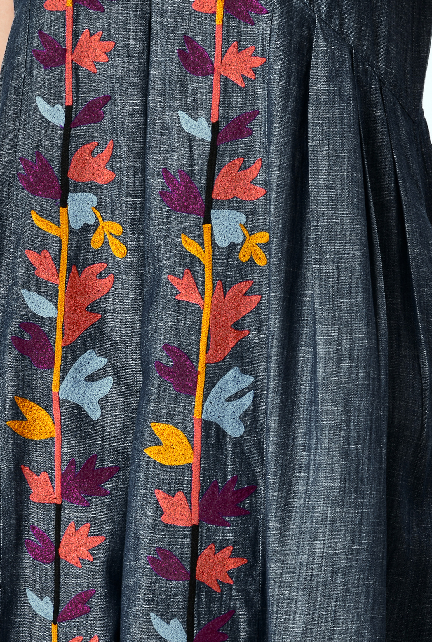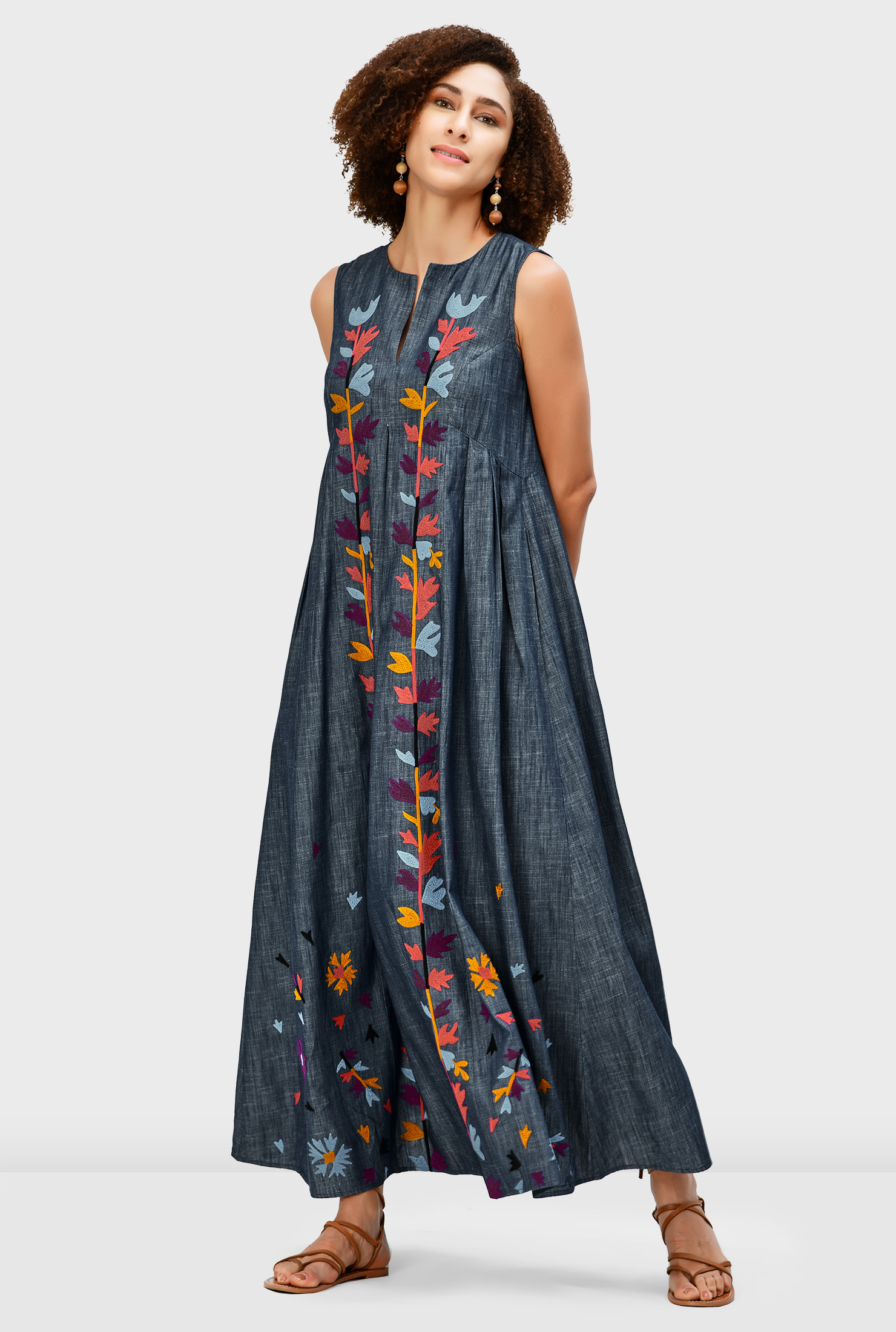 A relaxed chambray shift dress enriched with vibrant leafy embroidery and soft release pleats for flow, comfort, and effortless elegance.