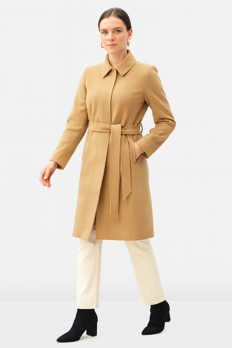 This Melton-look car coat brings a steady, tailored shape with its tight-knit construction and smooth khaki finish. The straight cut keeps the lines clear for easy layering, while the optional sash belt lets you define the waist without adding bulk. The fabric holds structure well, giving the coat a clean fall from shoulder to hem. Welt pockets blend into the body for a sharp, uninterrupted look. The weight and texture make it suitable for smart daytime dressing and light winter layering. Spot clean or dry clean to maintain texture and form.