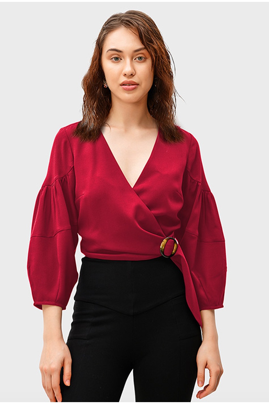 This crepe crop wrap top offers a clean, shaped silhouette with its V-neckline and belted wrap front that defines the waist without feeling tight. The ruched sleeves add subtle volume that balances the cropped length, while the crepe fabric gives the top a smooth drape and steady surface. Its rich tone and sharp lines make it suitable for smart-casual outings or evenings when you want a pulled-together look with easy movement. Pair it with high-waist trousers or skirts to keep the proportions balanced. Wash cold and dry low to maintain the texture and fit.