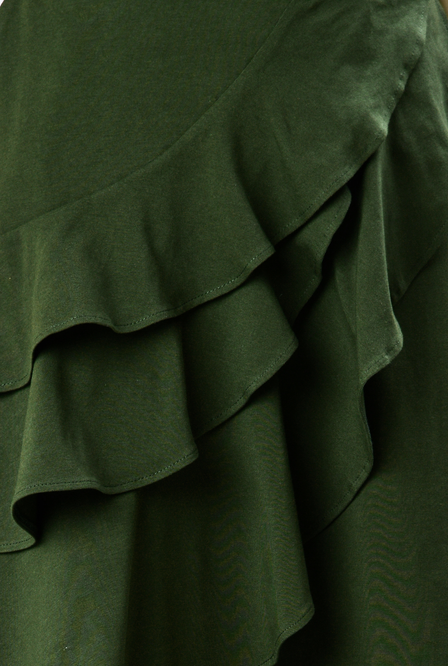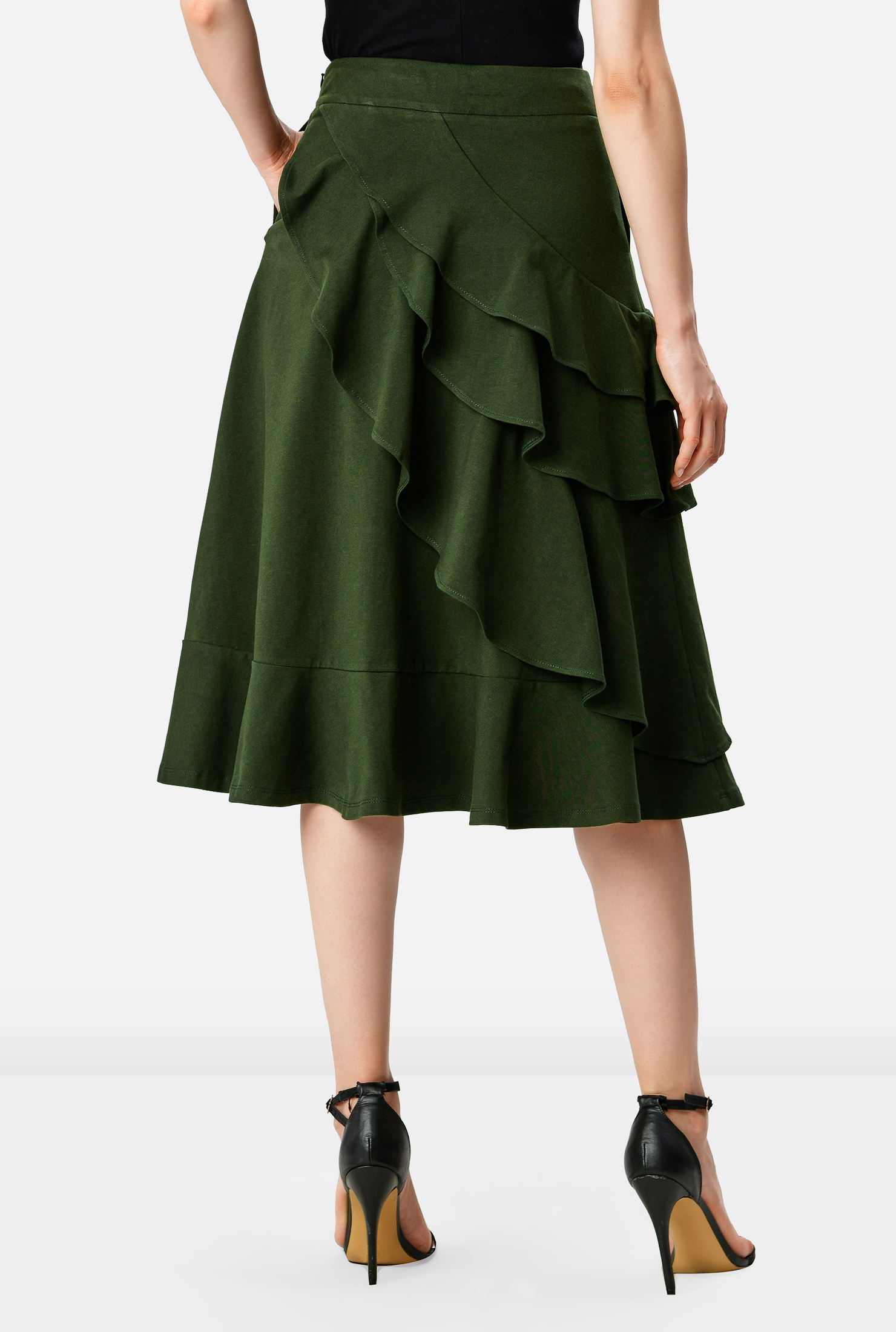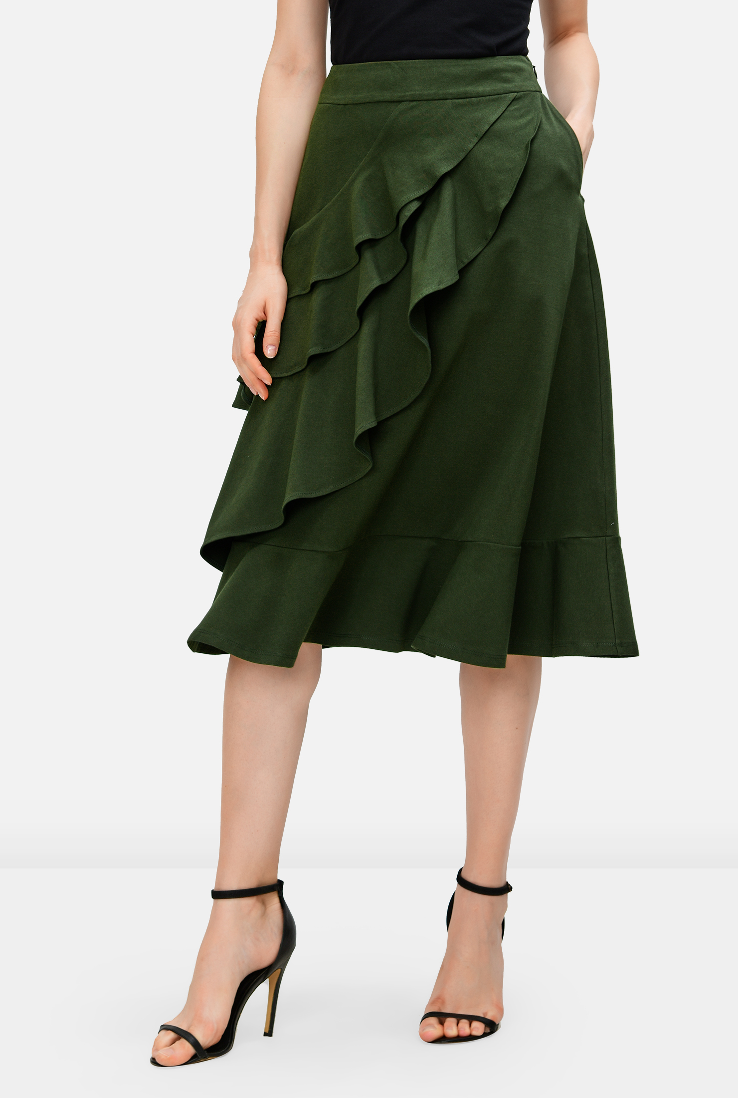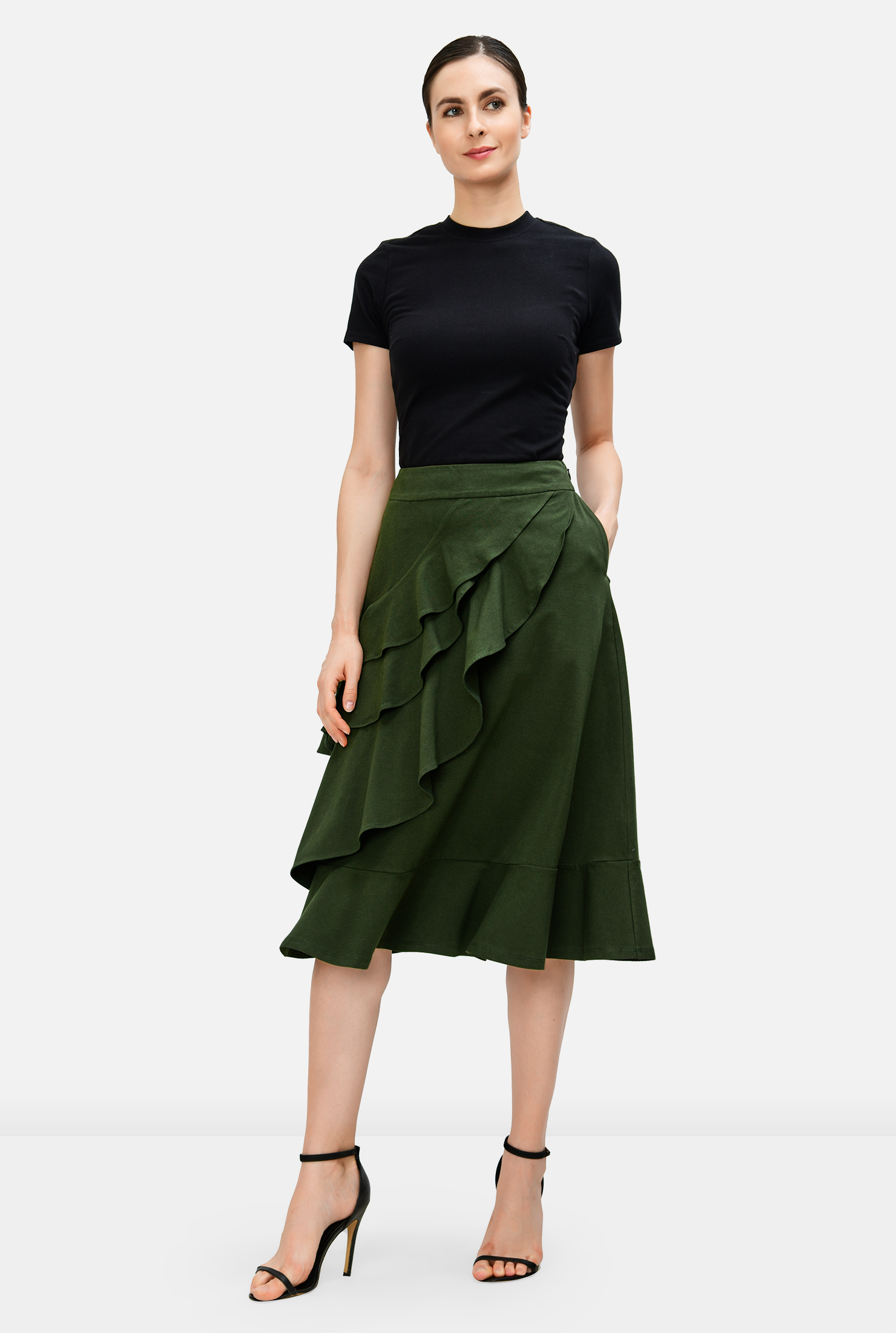 Asymmetric cascading ruffles create a flattering wrap-like effect, while the full flounce at the hem enhances the skirt’s twirl factor, making it ideal for days when you want a stylish yet effortless look.