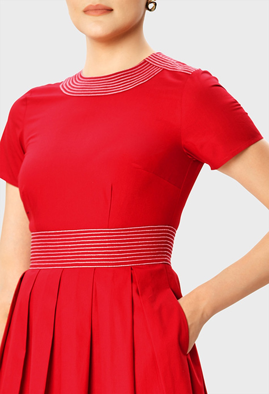 A cotton poplin fit-and-flare dress with trapunto trim at the neckline and waist. The crisp fabric, structured pleats, and clean lines create a polished work-casual look with steady movement and a defined shape.